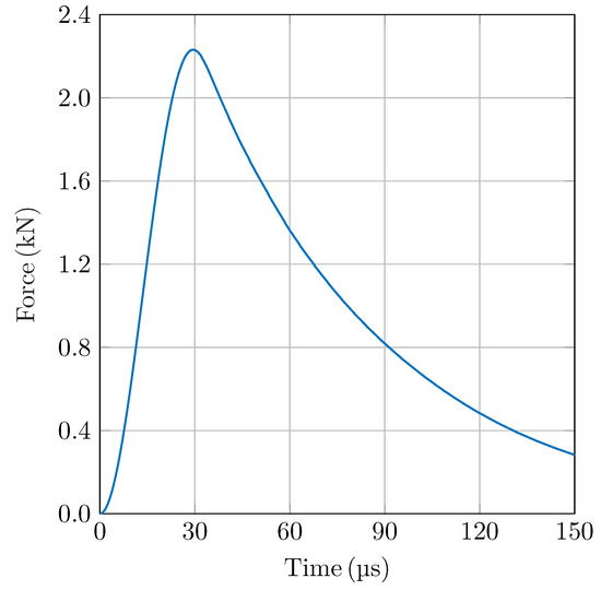 Figure 12 shows the time evolution of the electromagnetic force acting on the armature during the acceleration phase. The results indicate a sharp rise in force shortly after current injection, with a peak value of approximately reached within the first 30 . This high initial force is critical for rapidly accelerating the armature and achieving the required displacement within the desired time frame. The steep force rise is a direct consequence of the strong interaction between the high current density and the magnetic field concentrated near the rail and armature edges, as discussed previously.