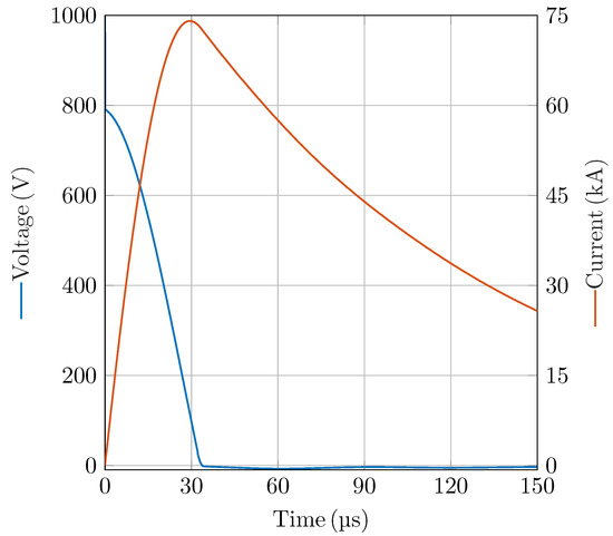 Figure 13 presents the capacitor bank voltage current during the railgun operation. It can be observed that the current rapidly rises to a peak value of approximately 75 within just 30 . Additionally, the initial voltage drop across the capacitor bank is not solely due to charge depletion, but is significantly influenced by the high rate of change of current (di/dt) and the parasitic inductance of the capacitor bank :