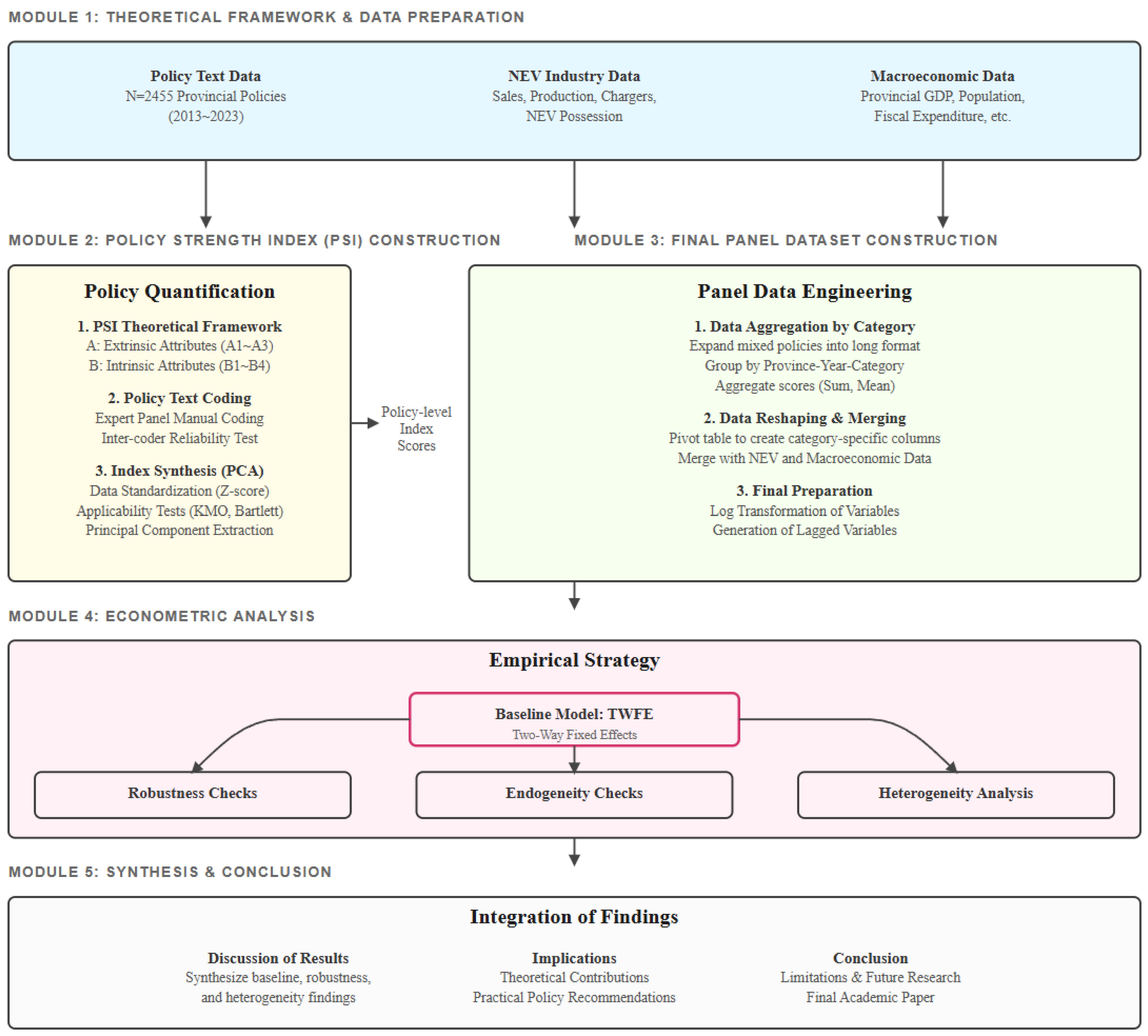 This section elaborates on the overall design and methodology of the study. Its core task is to construct an analytical framework capable of effectively quantifying the strength of provincial-level NEV policies in China. Based on this framework, an econometric model is specified to test the actual effects of policy strength on the development of the NEV industry.