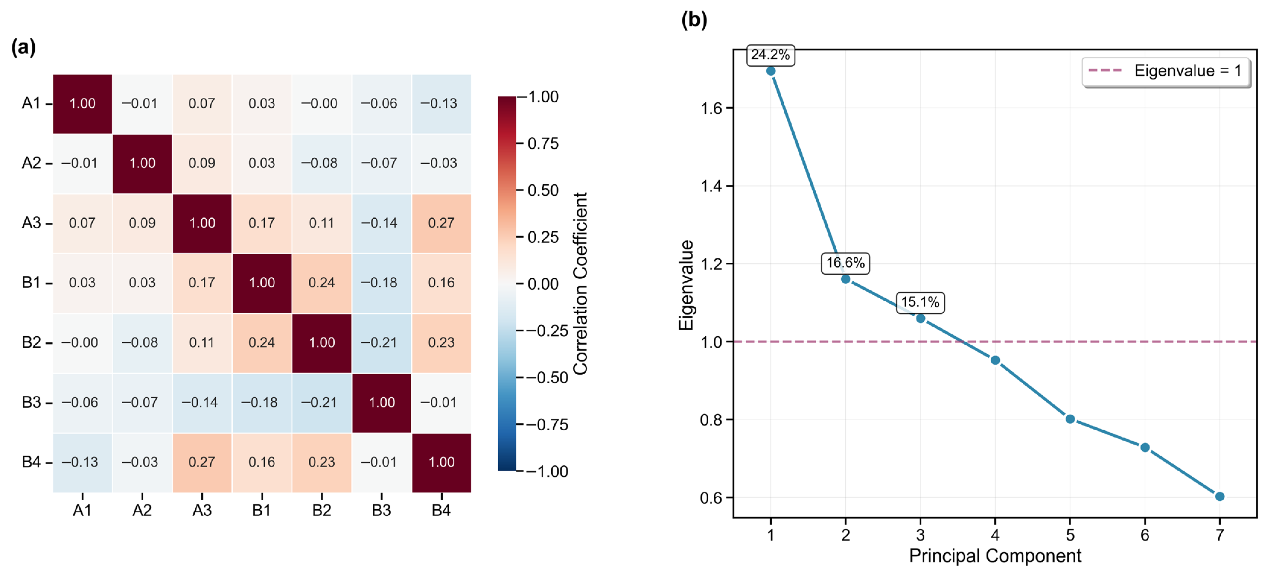 Figure 2a displays a heatmap of the correlation matrix among the seven dimensional indicators. It is evident that low-to-moderate correlations exist between the indicators. For instance, B4 (Resource Assurance) shows a significant positive correlation with A3 (Document Type Efficacy), B1 (Policy Instrument Strength), and B2 (Measure Intensity), with correlation coefficients of 0.27, 0.16, and 0.23, respectively. This suggests that policies with higher efficacy levels, stronger instruments, and more intense measures also tend to provide greater resource assurance. In contrast, B3 (Degree of Quantification) exhibits a negative correlation with most other dimensions, implying a potential trade-off between “target quantification” and other policy strength characteristics. The existence of these relationships provides a strong rationale for using PCA to address multicollinearity and extract composite dimensions.