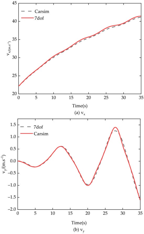 To validate the effectiveness of the established 7-degree-of-freedom vehicle model for the distributed-drive electric pickup truck, simulation results under sinusoidal steer conditions were compared against the Carsim vehicle model. As illustrated in Figure 3, the responses of sideslip angle, yaw rate, longitudinal velocity, and yaw velocity in the developed 7-DOF model closely match those of the Carsim benchmark.