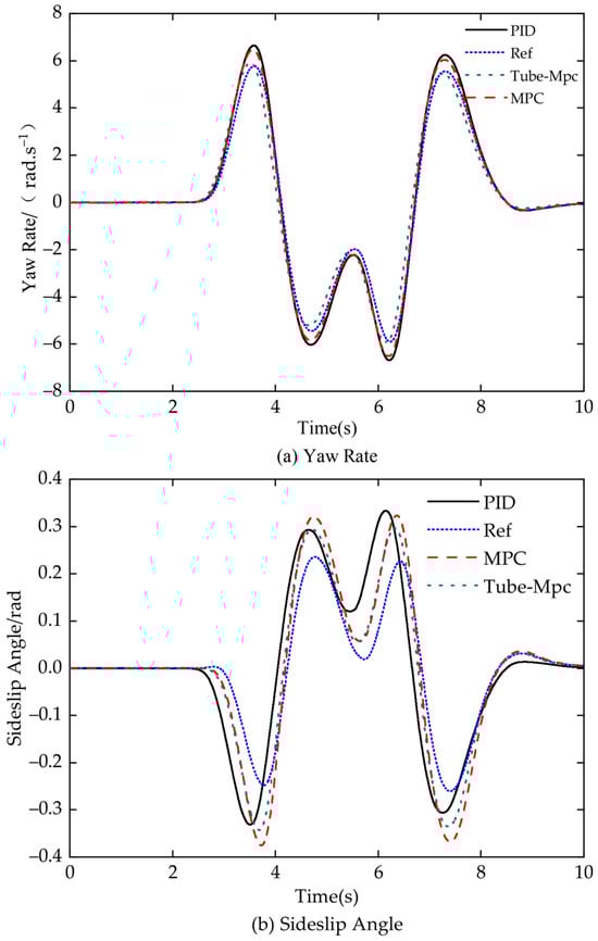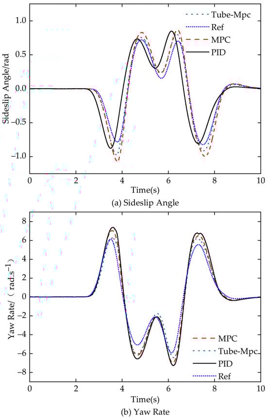 To validate the accuracy and real-time performance of the proposed hierarchical yaw stability control strategy, co-simulations were conducted using Simulink and Carsim. The double-lane change maneuver, characterized by significant path curvature variations, was selected to rigorously evaluate controller performance under medium-high speed conditions. Comparative simulations were performed at 80 km/h on a high-adhesion road surface (μ = 0.85), testing three controllers PID, conventional MPC, and Tube-MPC with road adhesion estimation. The results are presented in Figure 5.