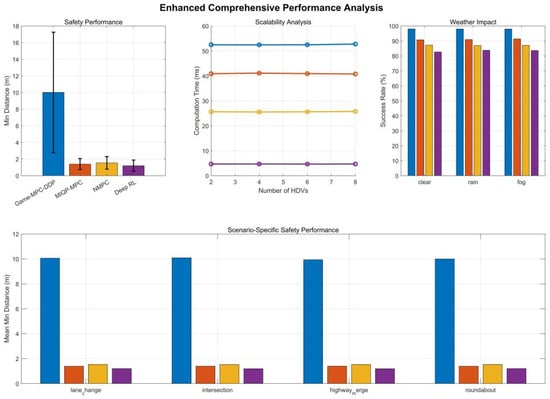 The results show that our method maintains an average minimum distance 6–8 times larger than the benchmarks. This directly translates into superior safety outcomes: zero collisions were recorded in all 2880 scenarios, compared to collision rates of 9.5% to 17.5% for other methods. Furthermore, the number of near misses (distance < 2 m) and Time-to-Collision (TTC) violations for our approach are negligible, approaching zero. The statistical significance of these differences is confirmed with p-values < 0.001 using Welch’s t-test, and the effect size (Cohen’s ) indicates a very large practical significance.