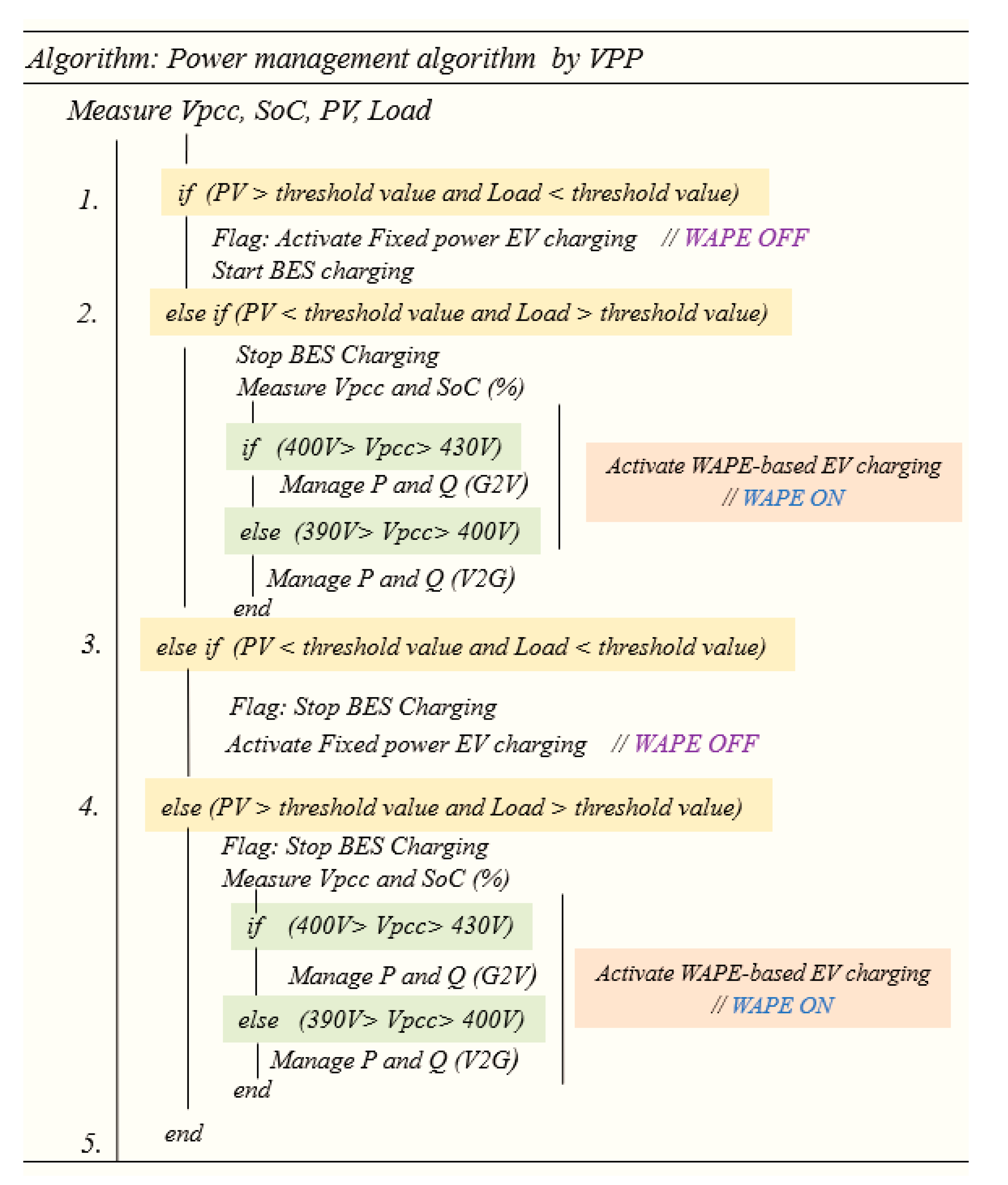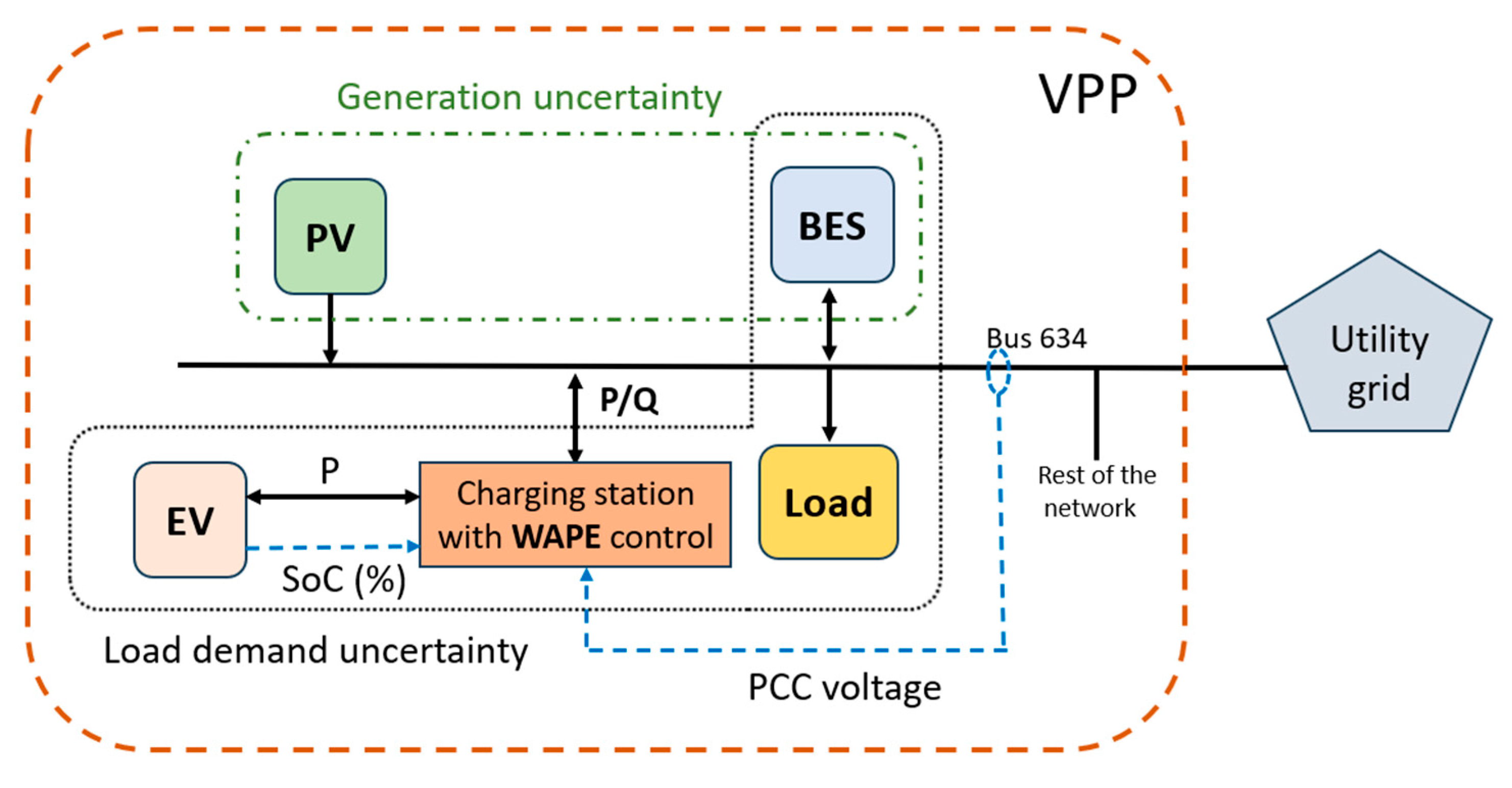 15] have not comprehensively addressed all key aspects of VPP operation, such as DER management, power coordination, V2G support, voltage regulation, and EV scheduling. In addition, existing VPP-based EV charging studies employ optimization-driven, predictive frameworks, focusing primarily on economic objectives such as cost minimization, profit maximization, or market participation. These approaches typically rely on forecasted load, renewable generation, and EV availability, and are solved over predefined scheduling horizons. While effective for strategic planning, such methods are less suited to addressing fast voltage dynamics and real-time grid disturbances arising from PV intermittency and simultaneous EV charging or sudden increase in peak load demand. In contrast, this paper proposes a WAPE-based VPP framework that enables real-time power management to effectively control and manage the entire system. The proposed framework continuously monitors PV output, load profile, BES, grid voltage and SoC of EV and then it dynamically regulates both active and reactive power accordingly without reliance on forecasts or repeated optimization, thereby enhancing voltage regulation and reducing charging time under dynamic operating conditions. The charging infrastructure considered includes PV generation, battery energy storage, and variable loads. The key contributions are as follows: