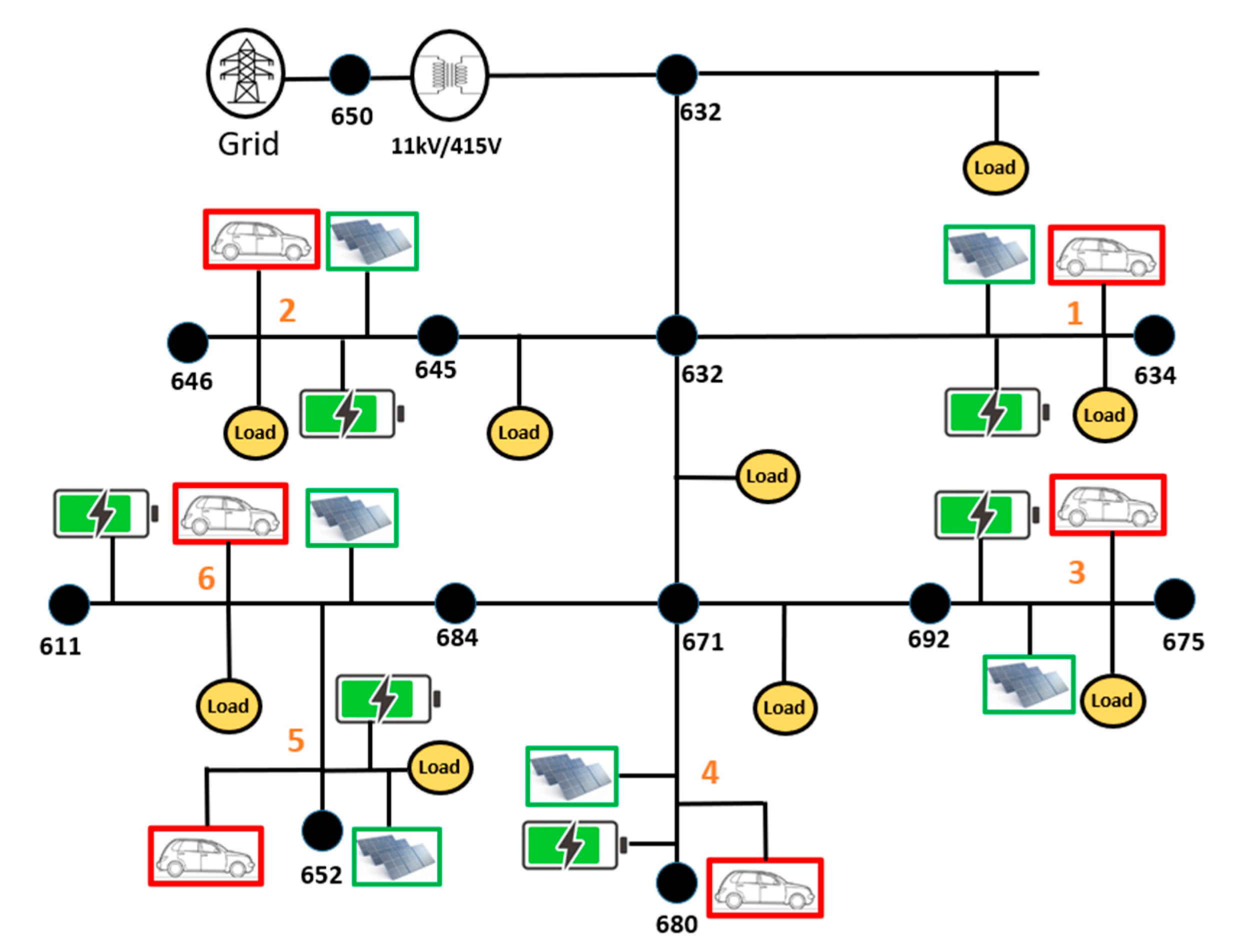 Figure 6, the locations of the six charging stations are illustrated, among which bus 646 is one of them. To demonstrate the dynamic variations in charging rate and grid voltage influenced by PV generation, bus 646 was selected as a representative case. Additionally, buses 634 and 611 were chosen to show the corresponding dynamic changes in charging power and grid voltage profiles under different operating conditions (Load and BES). These specific buses (646, 634 and 611) were selected to clearly emphasize the dynamic behavior of the system through