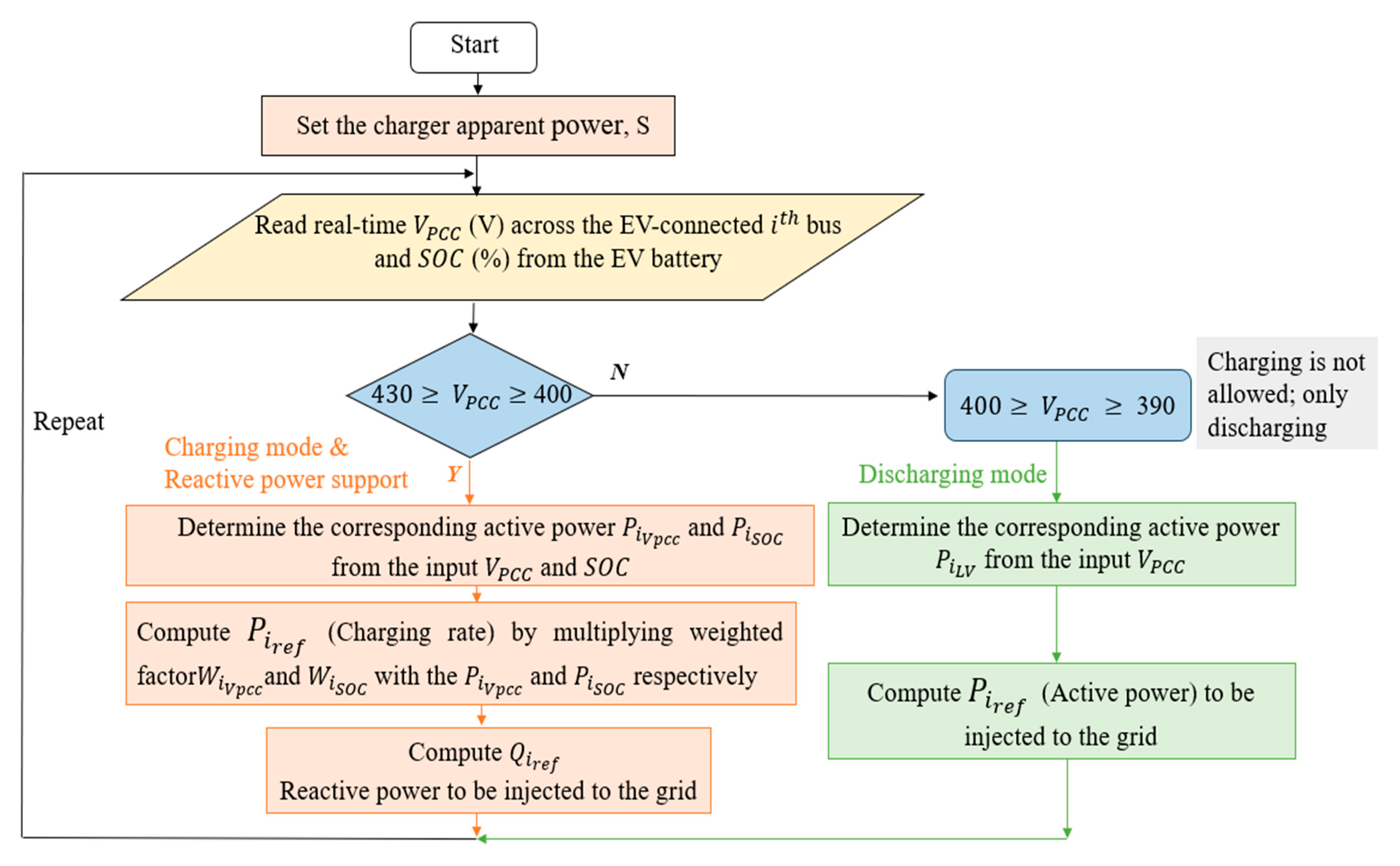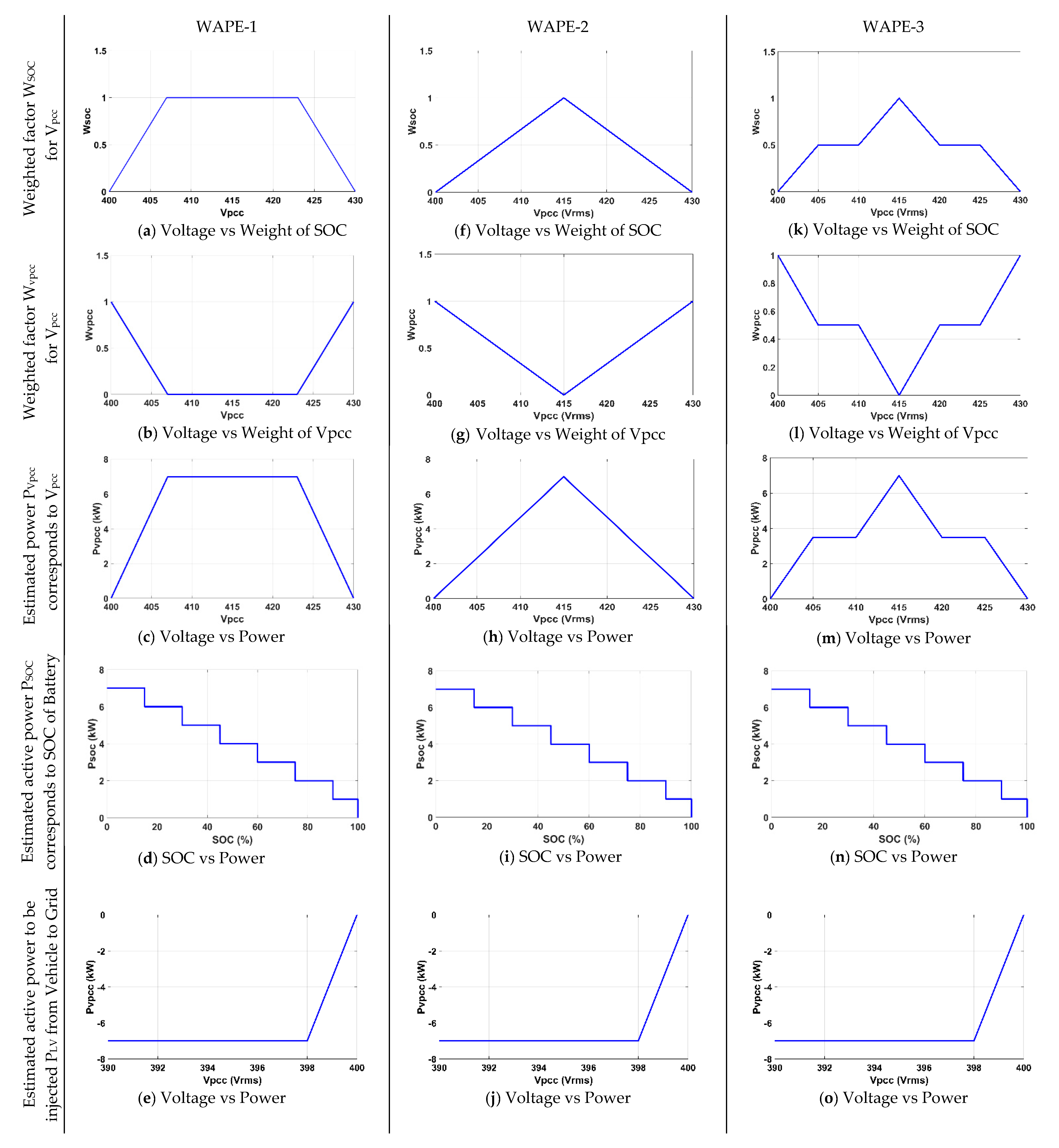 This scenario highlights the VPP’s role in enabling V2G services via EV discharging, thereby enhancing the grid’s voltage profile. Specifically, the VPP activates the WAPE-based control algorithm to enable connected EVs to operate in reverse mode, supplying active power back into the grid. The V2G function is triggered when the system detects that the grid voltage has dropped into a predefined critical range—typically between 390 V and 400 V—indicating a demand for supplementary power support. Once this voltage condition is met, and with the consent of the EV owner, the VPP initiates the discharging process.