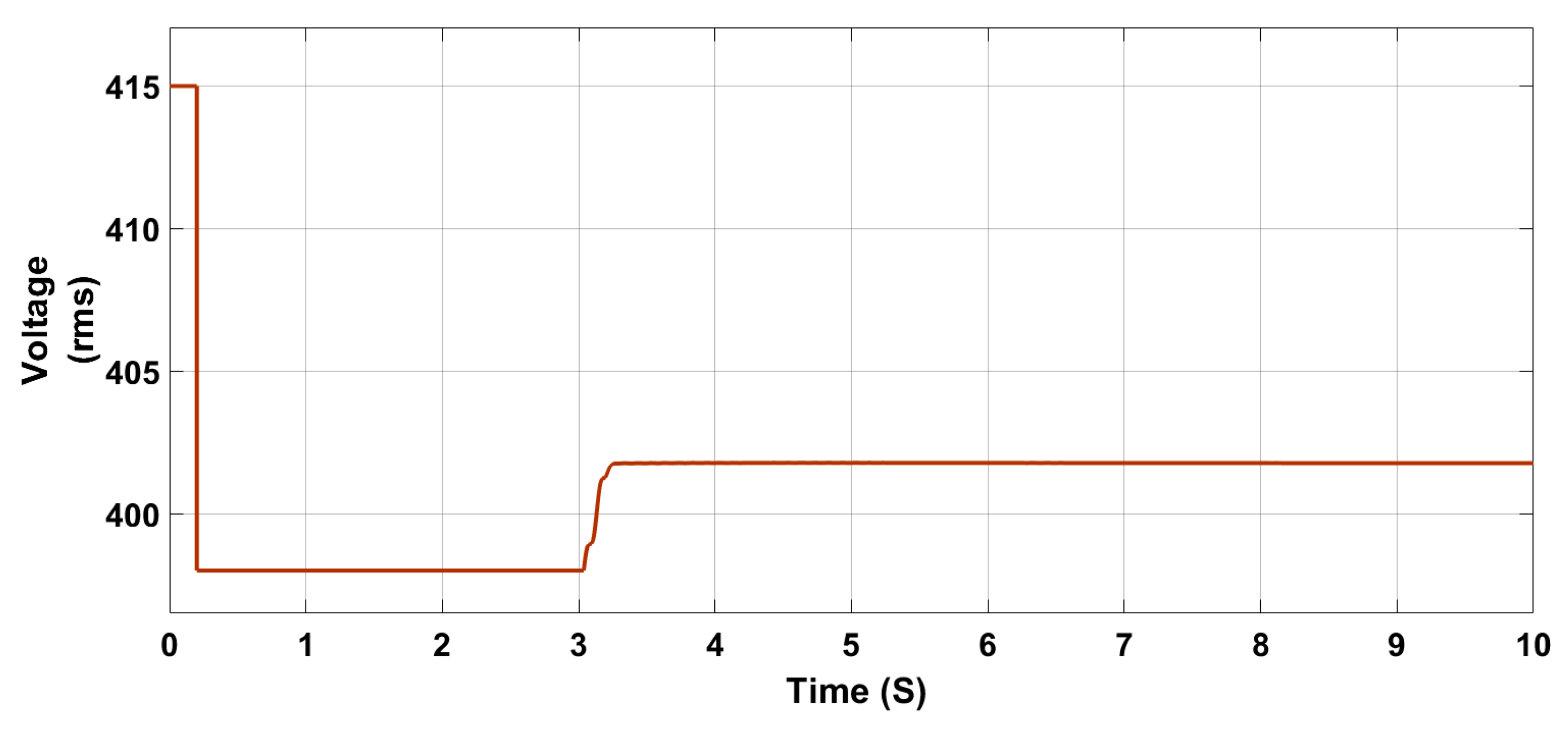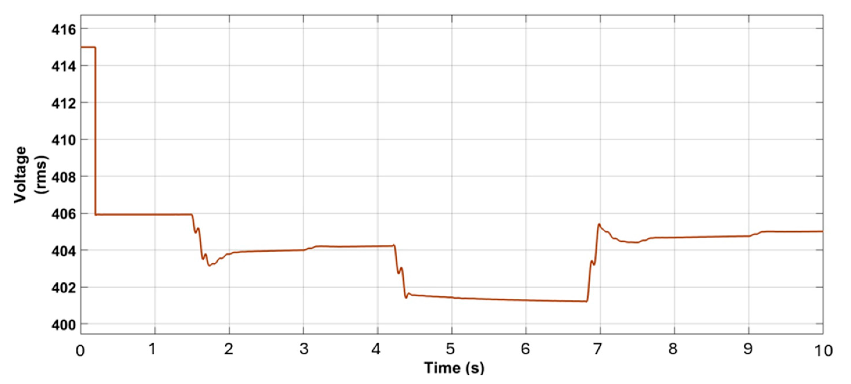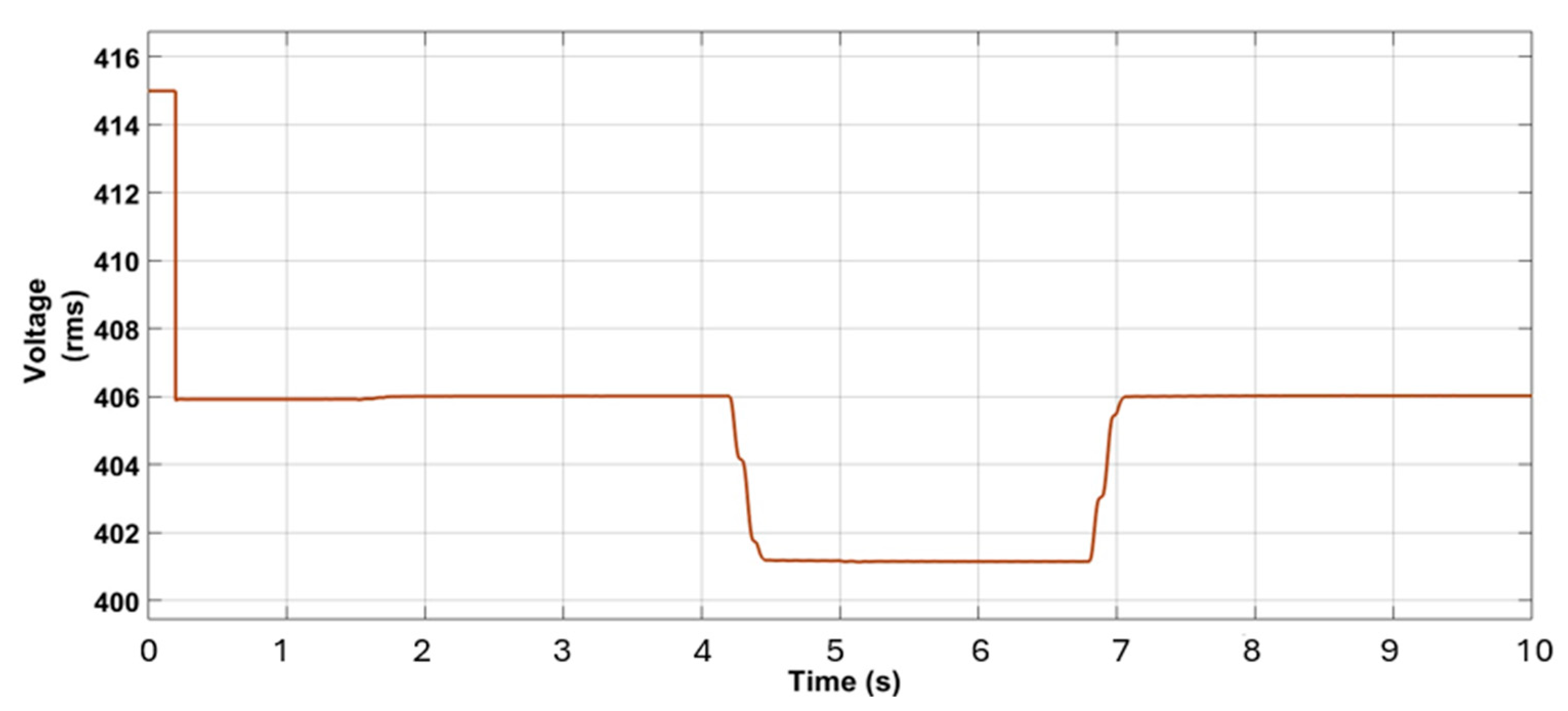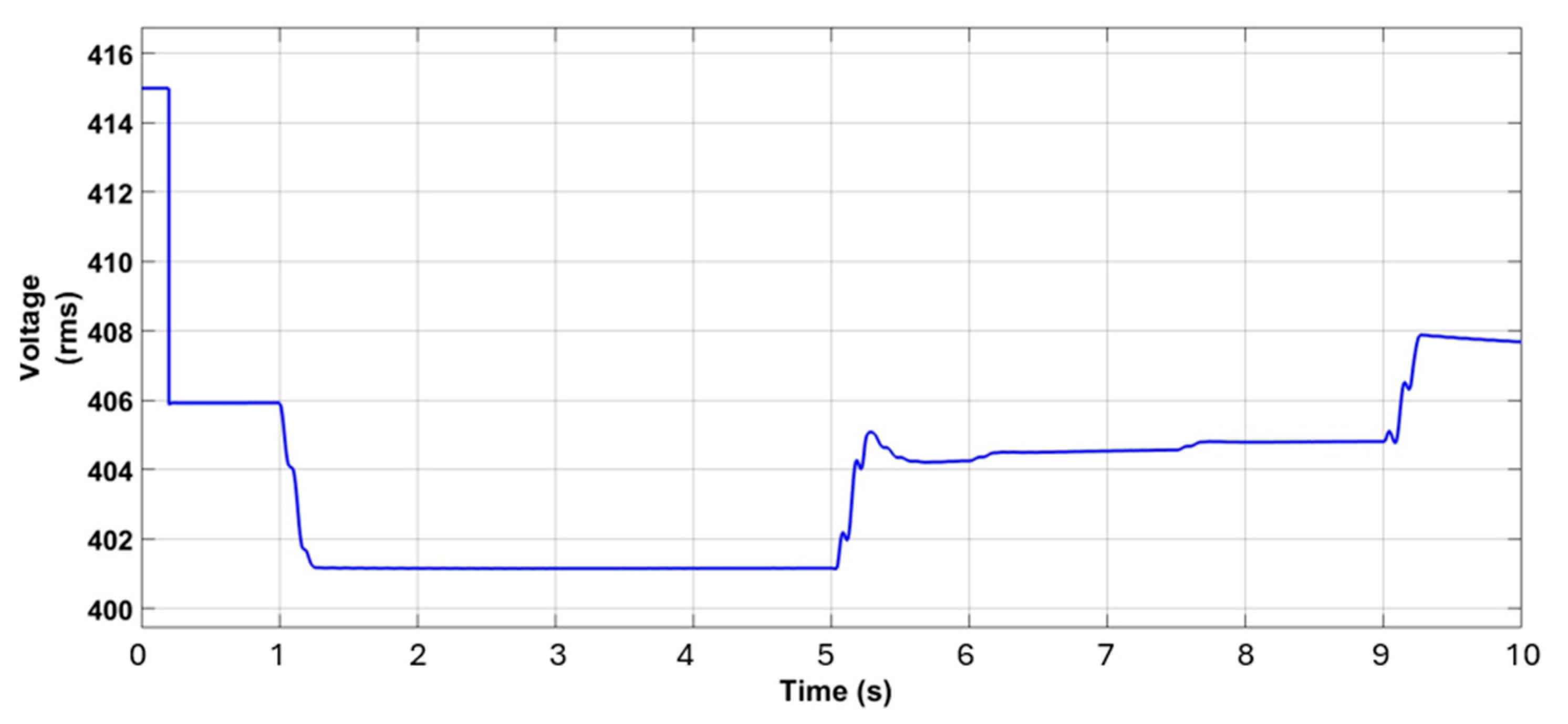 Figure 17, where a stable voltage level of approximately 401 V (during 4.2 s to 6.8 s) is consistently maintained. Additionally, the energy stored in the BES during peak generation is reserved for discharge during evening peak load times, especially when EV charging demand is elevated and photovoltaic generation is unavailable.