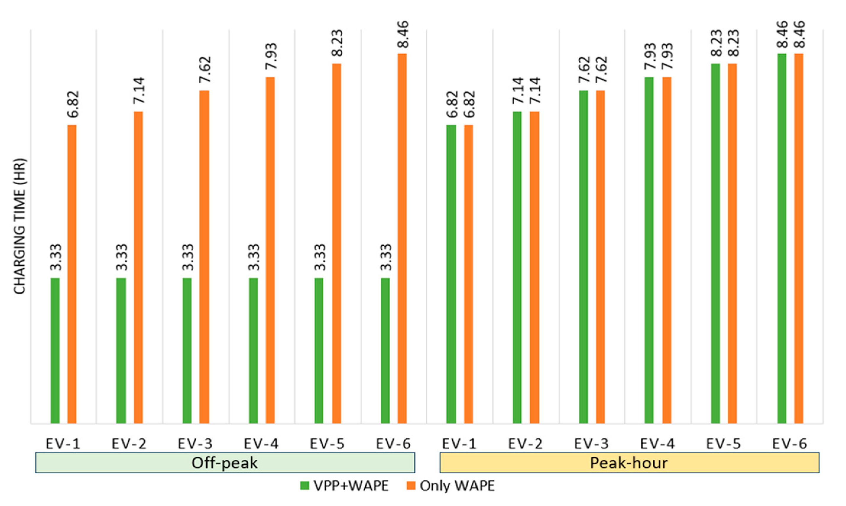 This section provides a detailed analysis of the VPP’s effectiveness in optimizing EV charging times across different load conditions. The analysis examines two operational configurations: (i) a system operating solely with the WAPE controller, and (ii) a system incorporating both the VPP and WAPE controllers. Charging performance was evaluated during two key timeframes—peak and off-peak periods—using a standardized 20 kWh battery capacity for each EV.