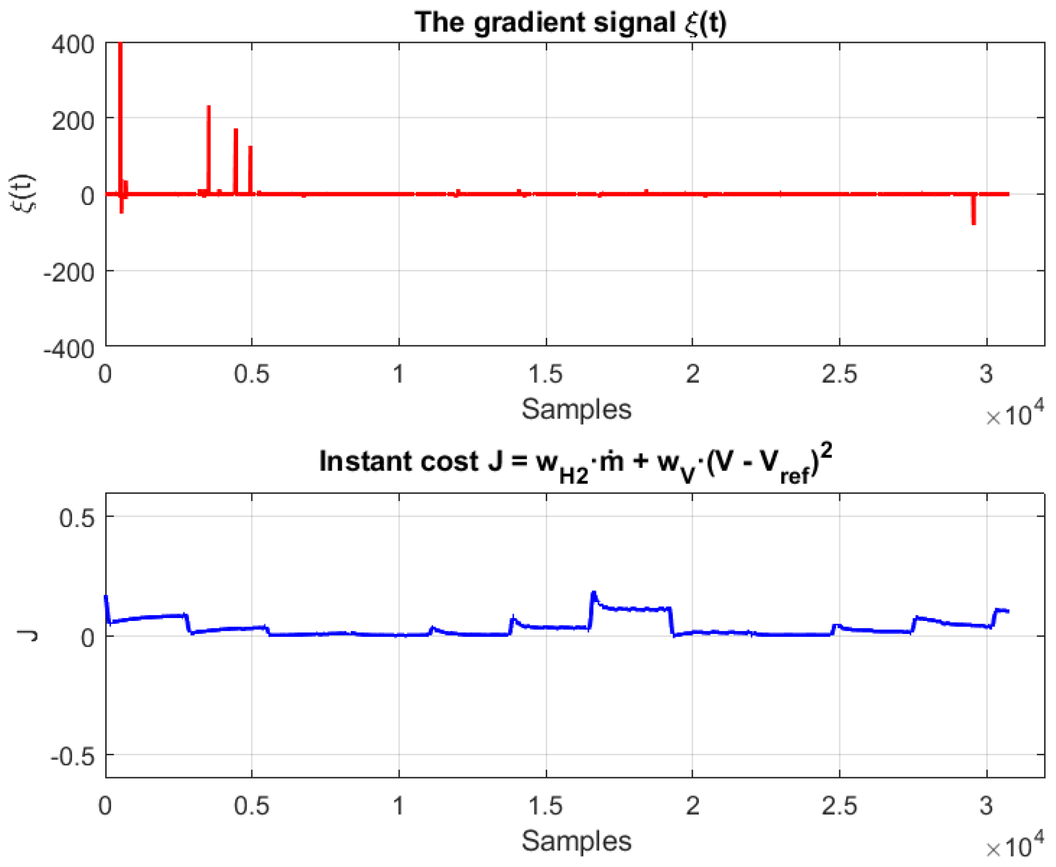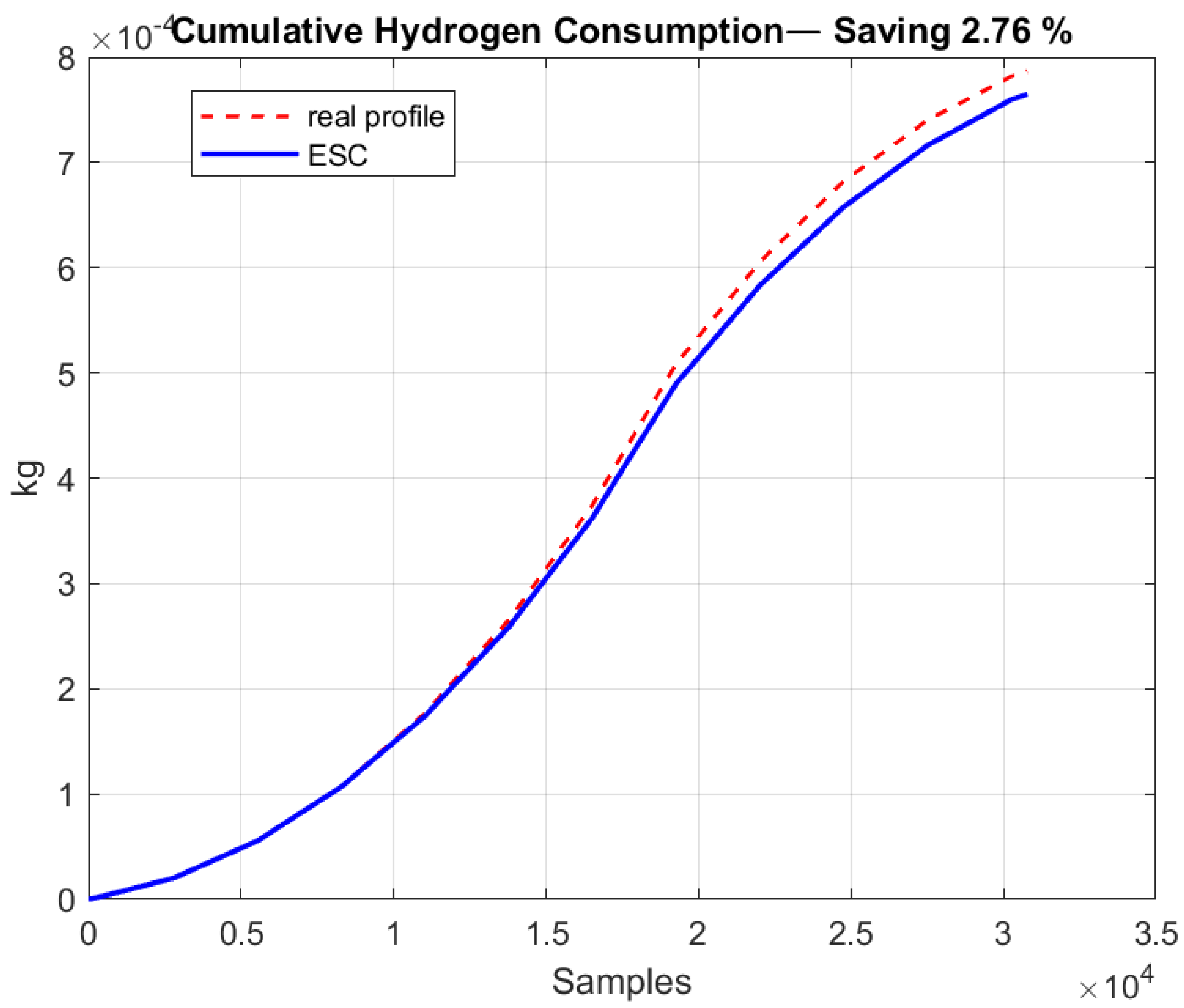 - The cost function calculation: ESC aims to minimize a trade-off between hydrogen consumption , computed via Faraday’s law as a function of current I, and the voltage tracking error . The trade-off is weighted by coefficients and .