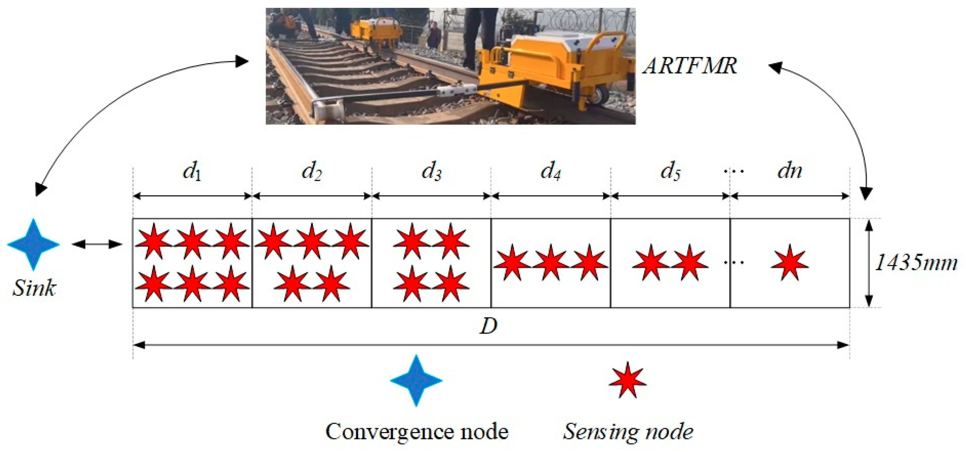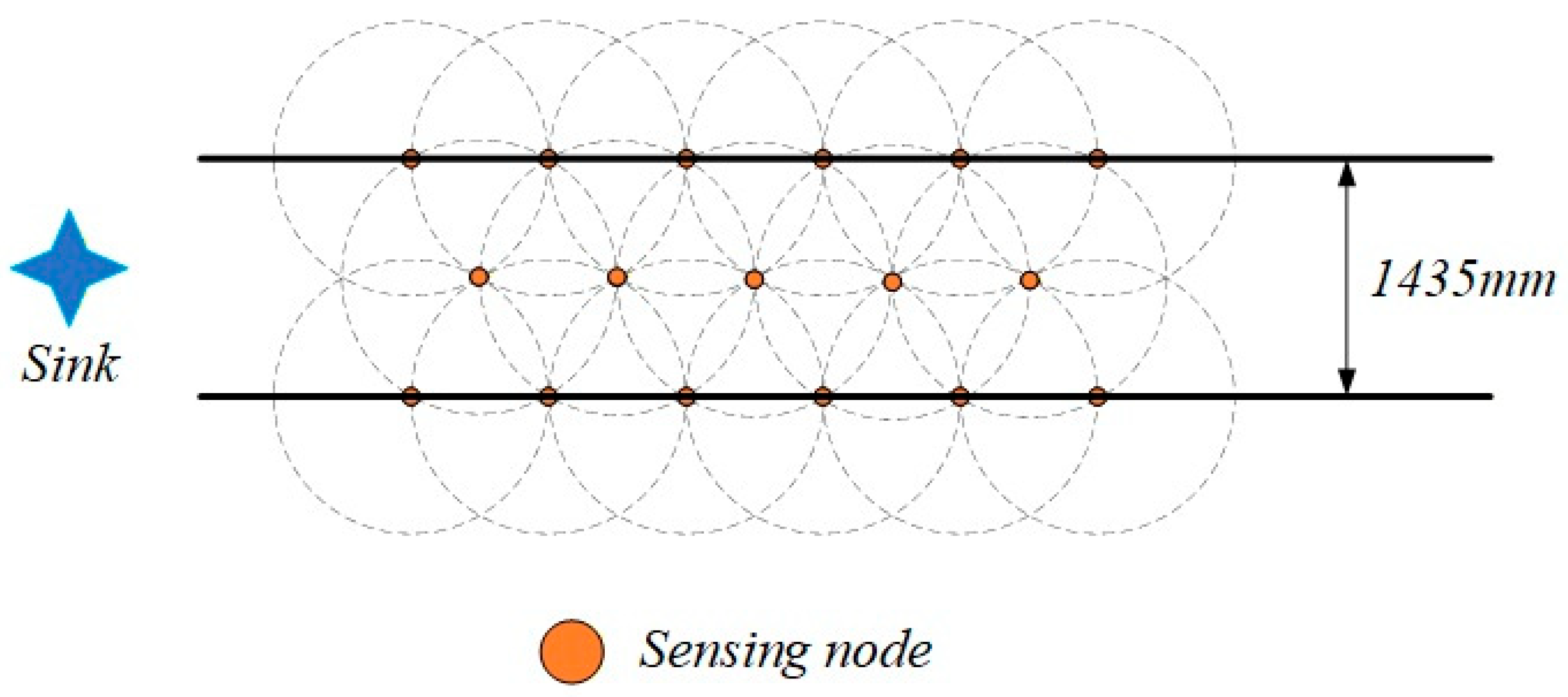 - Duan, J.; Shi, T.; Lv, X.; Li, Z. Optimal node deployment scheme for WSN-based railway environment monitoring system. In Proceedings of the 2016 Chinese Control and Decision Conference (CCDC), Yinchuan, China, 28–30 May 2016; pp. 6529–6534. [Google Scholar]