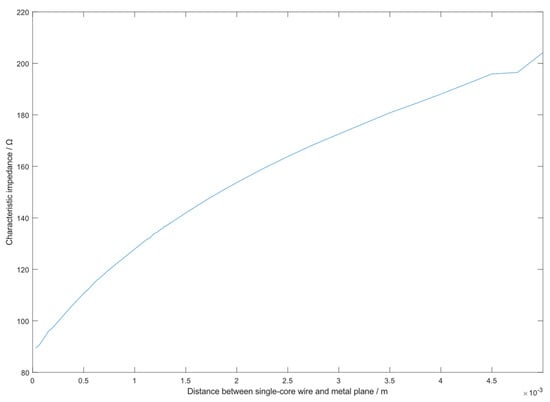 Based on the parameters in Table 1, a model was built in Ansys Q3D Extractor. The distance D between the cable and the metal plane was swept. After extracting the distributed parameters (R, L, C, G), the data were imported into MATLAB to calculate the characteristic impedance as a function of D, as shown in Figure 2. The simulation in Q3D was performed under electrostatic and magnetostatic assumptions at a frequency of 10 MHz to extract the dominant per-unit-length capacitance and inductance, which are relatively frequency-independent for this geometry in the relevant spectrum.