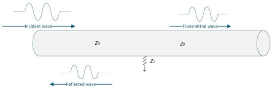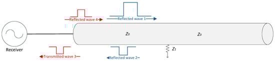 When a cable is damaged somewhere, it may cause the characteristic impedance of the cable to change, resulting in a mismatch between the characteristic impedance of the damaged cable and the healthy cable. The incident traveling wave signal in the cable will be reflected at the impedance mismatch [18]: if the impedance at the damage is larger than the normal characteristic impedance, the reflection coefficient is positive, and the reflected wave has the same polarity as the incident wave; if the impedance at the damage is smaller than the normal characteristic impedance, the reflection coefficient is negative [19,20], and the reflected wave is opposite to the incident wave. The calculation formula of the reflection coefficient is as follows: