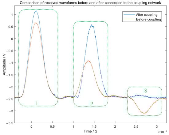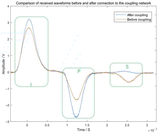 Experimental waveform comparison for an open-circuit fault: The red solid curve shows the signal received without the coupling network. The blue dashed curve shows the signal with the coupling network in place. The key signal features that are marked are as follows: the incident pulse (I), the primary reflection (P) from the fault, and the secondary reflection (S) caused by incident-end mismatch. The primary reflection (P) for a short-circuit fault exhibits negative polarity.