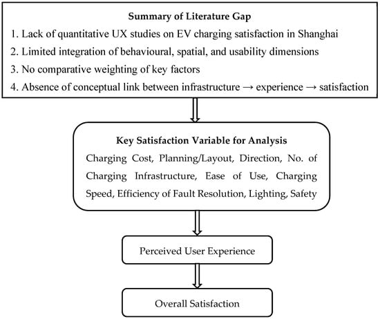 Despite growing interest, there remains a dearth of quantitative UX studies focused on Shanghai, especially those incorporating behavioral metrics and multivariate satisfaction models. This study addresses that gap, offering a localized, data-driven analysis of Shanghai EV users’ infrastructure experience while providing insights generalizable to other rapidly urbanizing regions. Figure 2 shows the summary of literature gap and variable tested in this analysis.