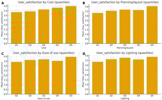 To ensure the stability of the results, an ordered logit regression was estimated as an alternative to the OLS specification, given the ordinal nature of the satisfaction variable. The results were consistent with the main model: planning/layout, ease of use, cost, and lighting remained statistically significant predictors with the same directional effects. Coefficient magnitudes and significance levels showed only minor variation, confirming robustness.