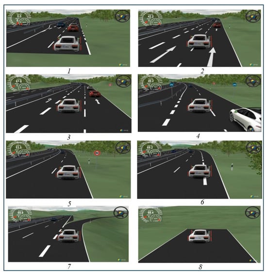 Simulated Scenario in the IPG Carmaker Simulator. (1: preparing for lane change, 2: executing lane change, 3: preparing for double lane change, 4: executing double lane change, 5: executing double lane change, 6: executing double lane change, 7: executing lane keeping, 8: executing lane keeping).