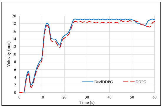 Longitudinal Velocity of the Duel Deep Deterministic Policy Gradient (Duel-DDPG) and Deep Deterministic Policy Gradient (DDPG) Algorithms.