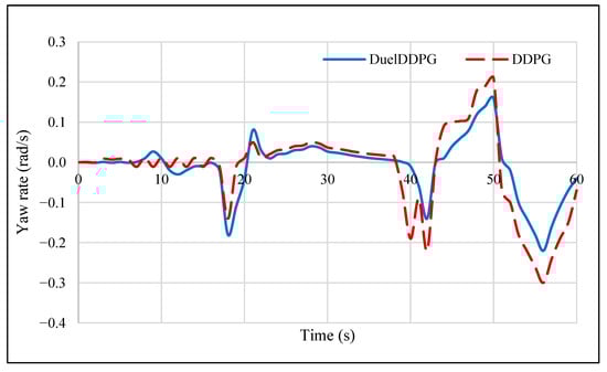 Yaw rate of the Duel Deep Deterministic Policy Gradient (Duel-DDPG) and Deep Deterministic Policy Gradient (DDPG) Algorithms.