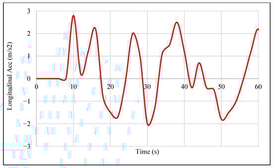 As shown in Figure 7, the scenario has been implemented in the Carmaker simulator. In this scenario, the vehicle travels at a speed of 70 k/h and, faced with a relatively complex traffic environment, performs maneuvers such as lane changes, double lane changes, and lane keeping to navigate through traffic in rainy road conditions, ultimately approaching and exiting the highway. In this scenario, the Duel-DDPG algorithm successfully executed lane changes, double lane changes, and lane keeping maneuvers safely and efficiently without collisions, despite the rainy weather and a 10% uncertainty in the autonomous vehicle weight, ultimately exiting the highway. Subsequent, an analysis of the longitudinal acceleration and velocity profiles of the autonomous vehicle under the Duel-DDPG algorithm in the presence of uncertainty is presented, and these results are compared with those under normal conditions.