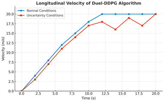 Longitudinal velocity of the Duel Deep Deterministic Policy Gradient (Duel-DDPG) algorithm under normal and uncertainty conditions.