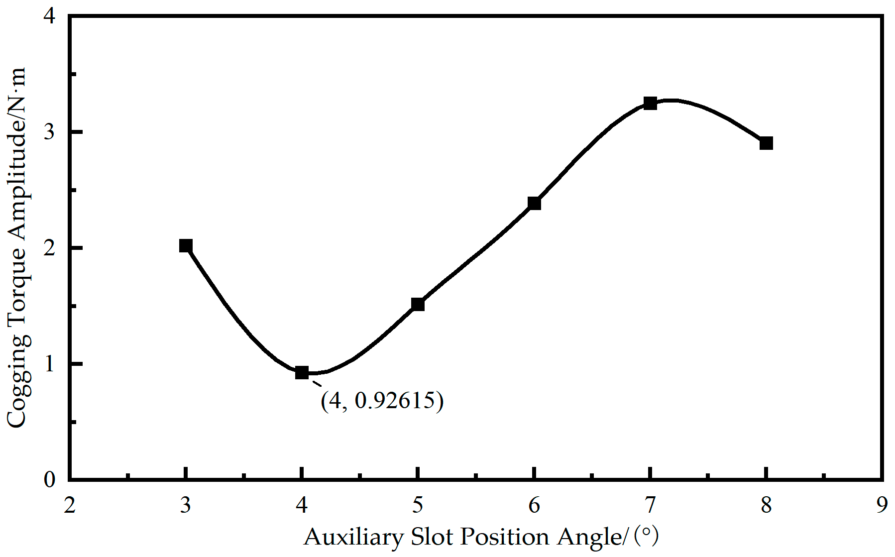 β increases from 3° to 4°, the cogging torque amplitude decreases correspondingly, reaching a minimum value of 0.92 N·m at
