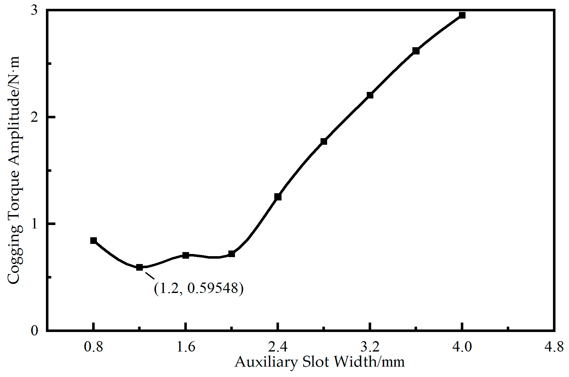 w is within the range of 0.8 mm to 2 mm, the amplitude of cogging torque shows no significant change, reaching a minimum value of 0.6 N·m at