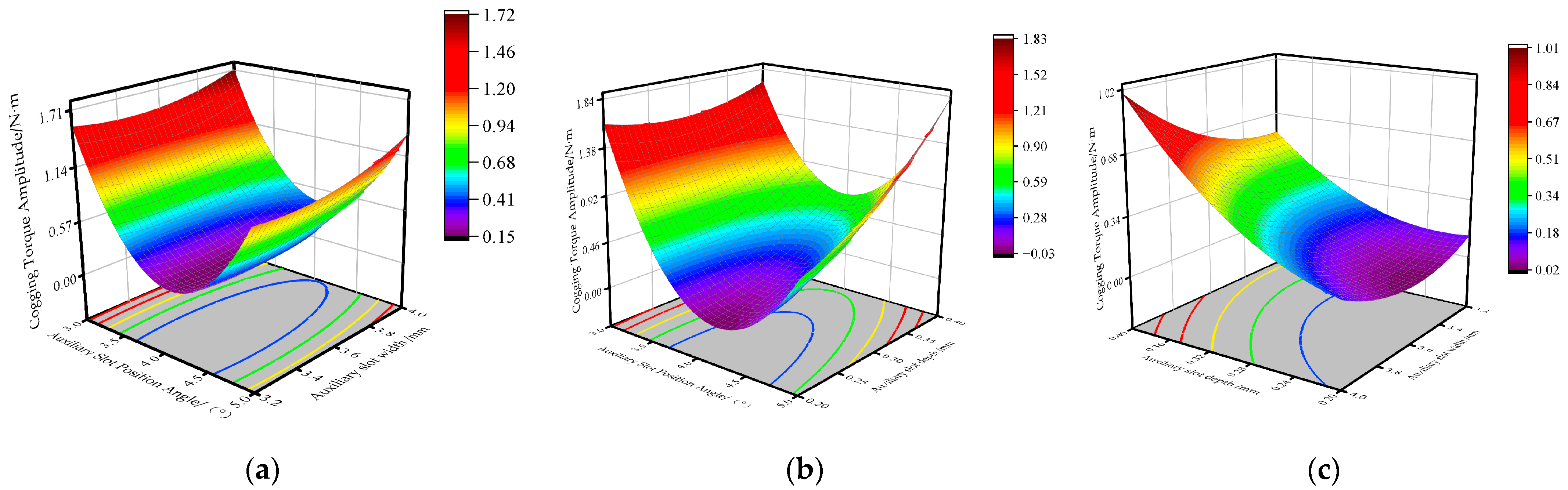 The steeper the slope of the response surface, the greater the influence of that factor on the amplitude of the cogging torque. Within the test range, the interaction between the slot position angle and slot depth exerts a more significant effect on the cogging torque.