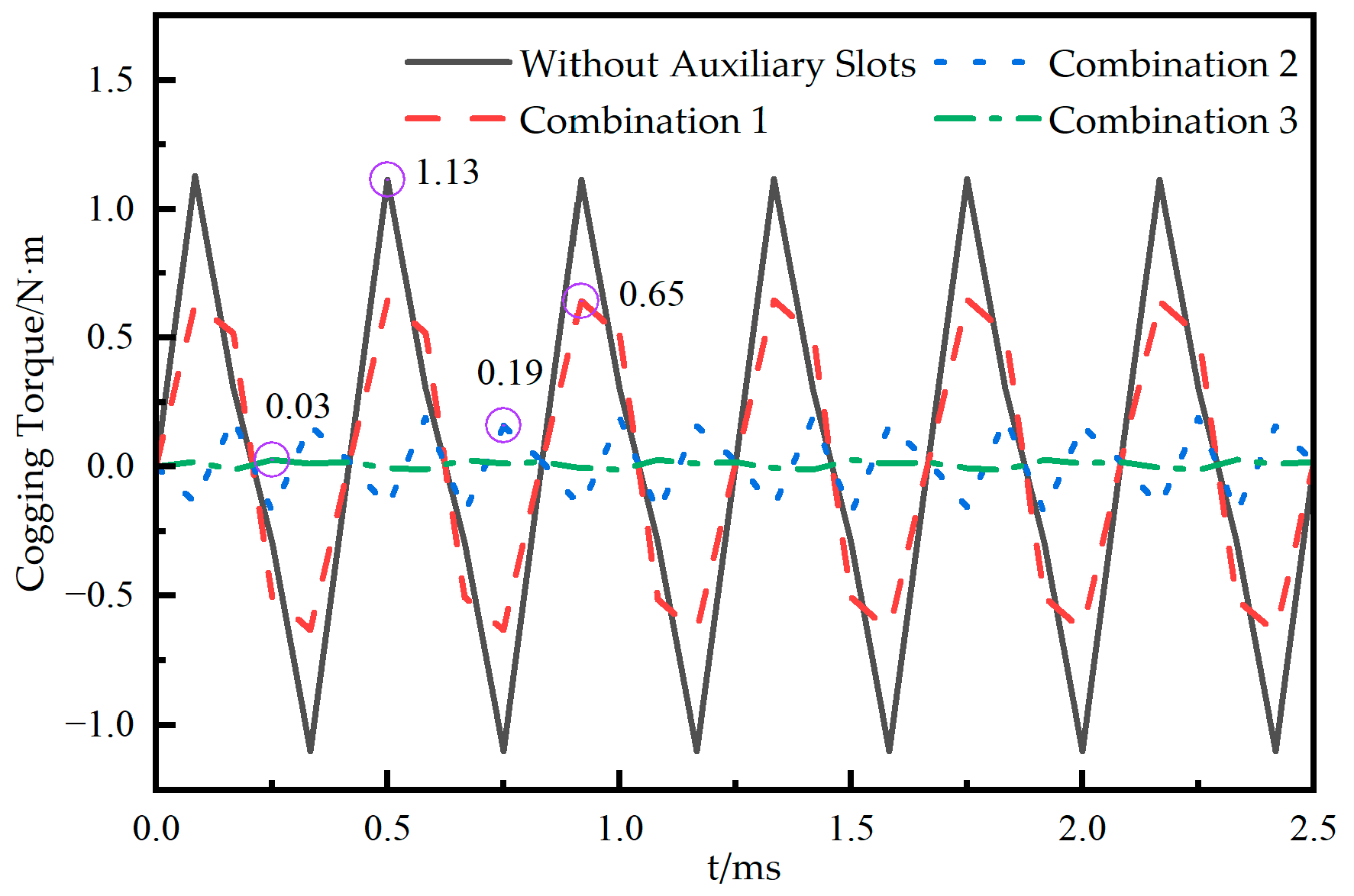Figure 10, without auxiliary slots, the cogging torque amplitude is 1.13 N·m. After adopting Combination 1 auxiliary slots, the amplitude decreases to 0.65 N·m, representing a reduction of 42.5%. With Combination 2 auxiliary slots, the cogging torque further decreased to 0.19 N·m, representing an 83.2% reduction; With Combination 3 auxiliary slots, the cogging torque amplitude decreased to 0.03 N·m, achieving an overall reduction of 97.3%.