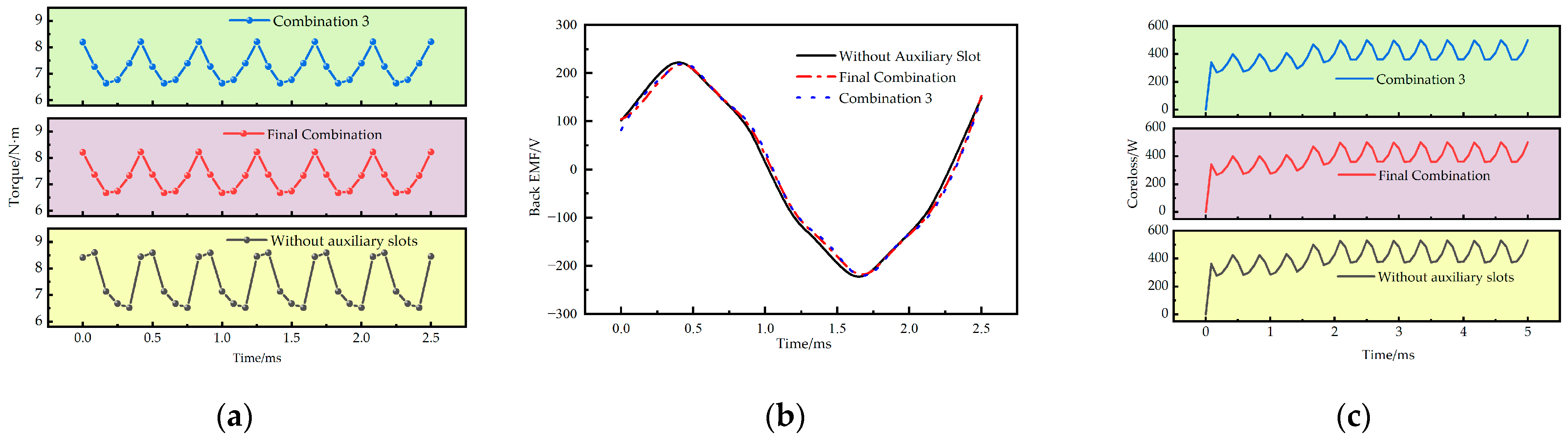 After introducing stator auxiliary slots, the motor maintains its average torque and back EMF performance while reducing torque ripple and total system losses. This demonstrates that the auxiliary slots do not adversely affect the motor’s core performance. Instead, they achieve comprehensive performance optimization while preserving output capability. Furthermore, the final rounded combination exhibits highly consistent performance with Combination 3 across all key indicators, validating the rationality of the parameter rounding. Therefore, the final combination: β = 4.2°, w = 3.6 mm, d = 0.2 mm—not only fully inherits the benefits of the theoretical optimization but also offers greater manufacturability and practical application value.