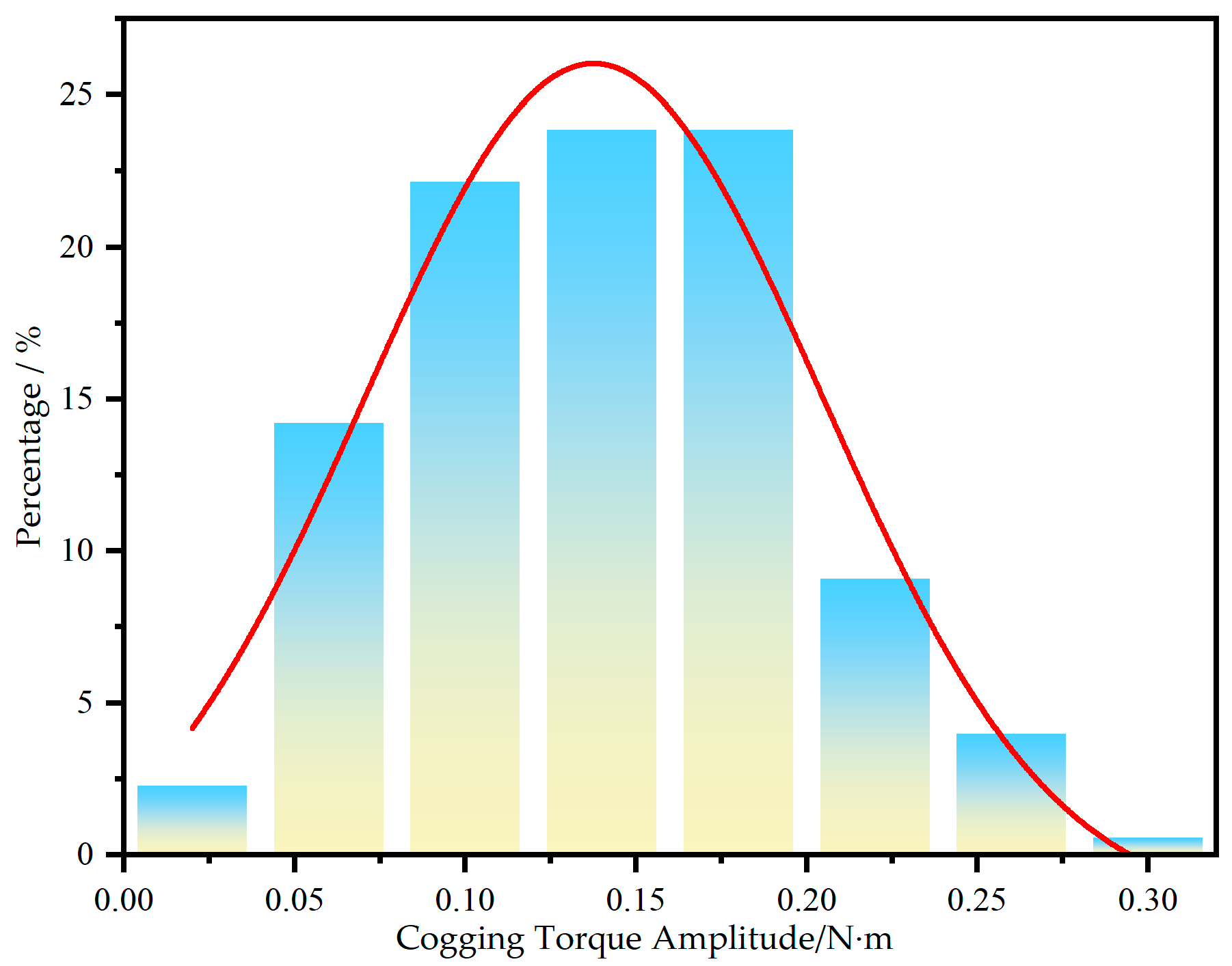 Figure 13 illustrates the influence of fluctuations in key parameters within a ±5% range on the distribution of cogging torque amplitude, with the horizontal axis representing the cogging torque amplitude and the vertical axis representing the probability density.