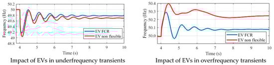 Simulations further revealed that uncontrolled charging can exacerbate frequency instability during system disturbances, while flexible EV loads can support frequency containment and prevent blackouts, as shown in Figure 7 [43].