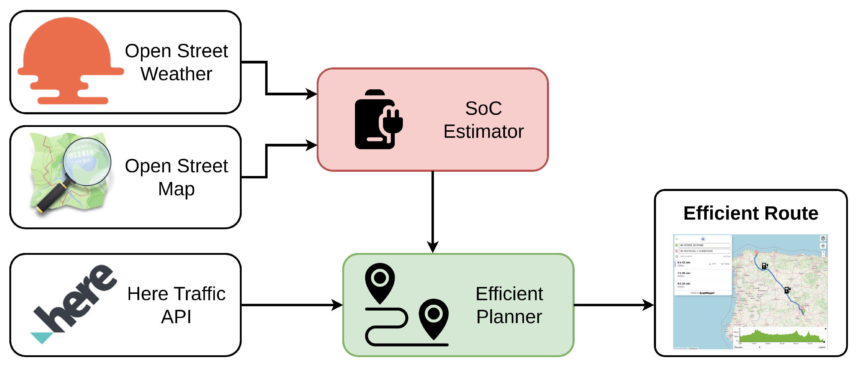 System flowchart illustrating the interaction between static map data, dynamic information, the consumption model, and the route planner.