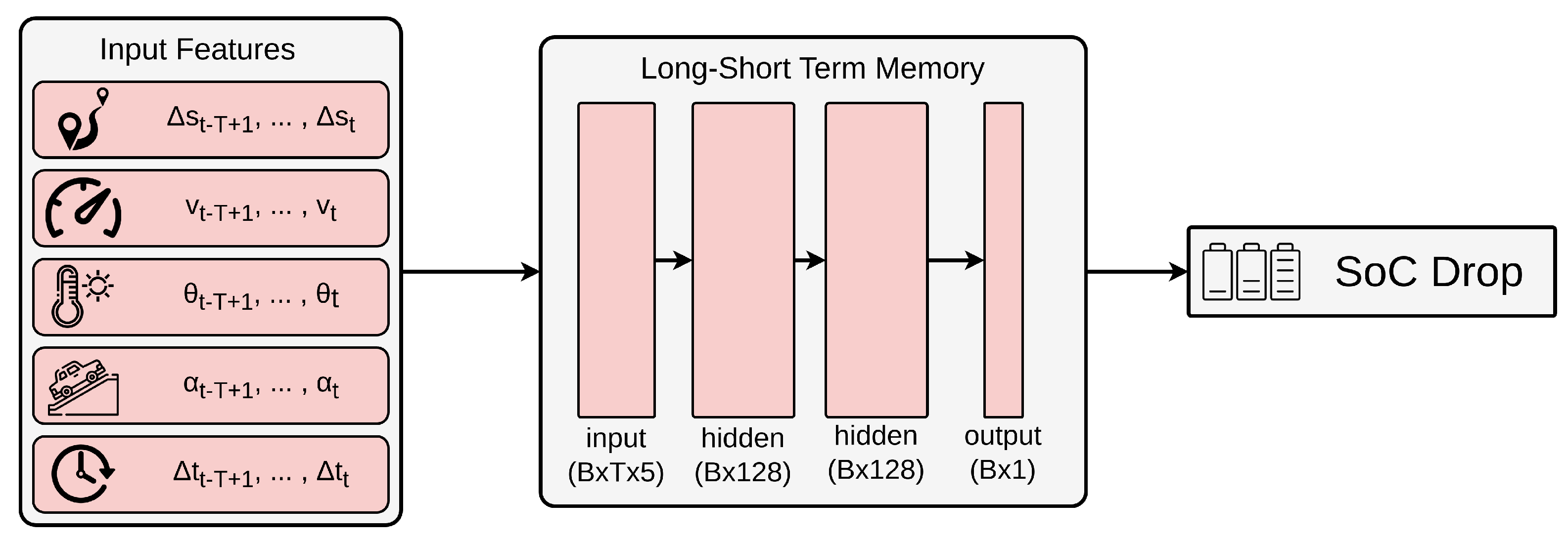 Schematic of the proposed LSTM-based architecture. Input sequences include distance, velocity, temperature, road inclination, and time increment features, arranged in a tensor of shape . These are processed by the LSTM and a fully connected layer to predict the SoC drop.