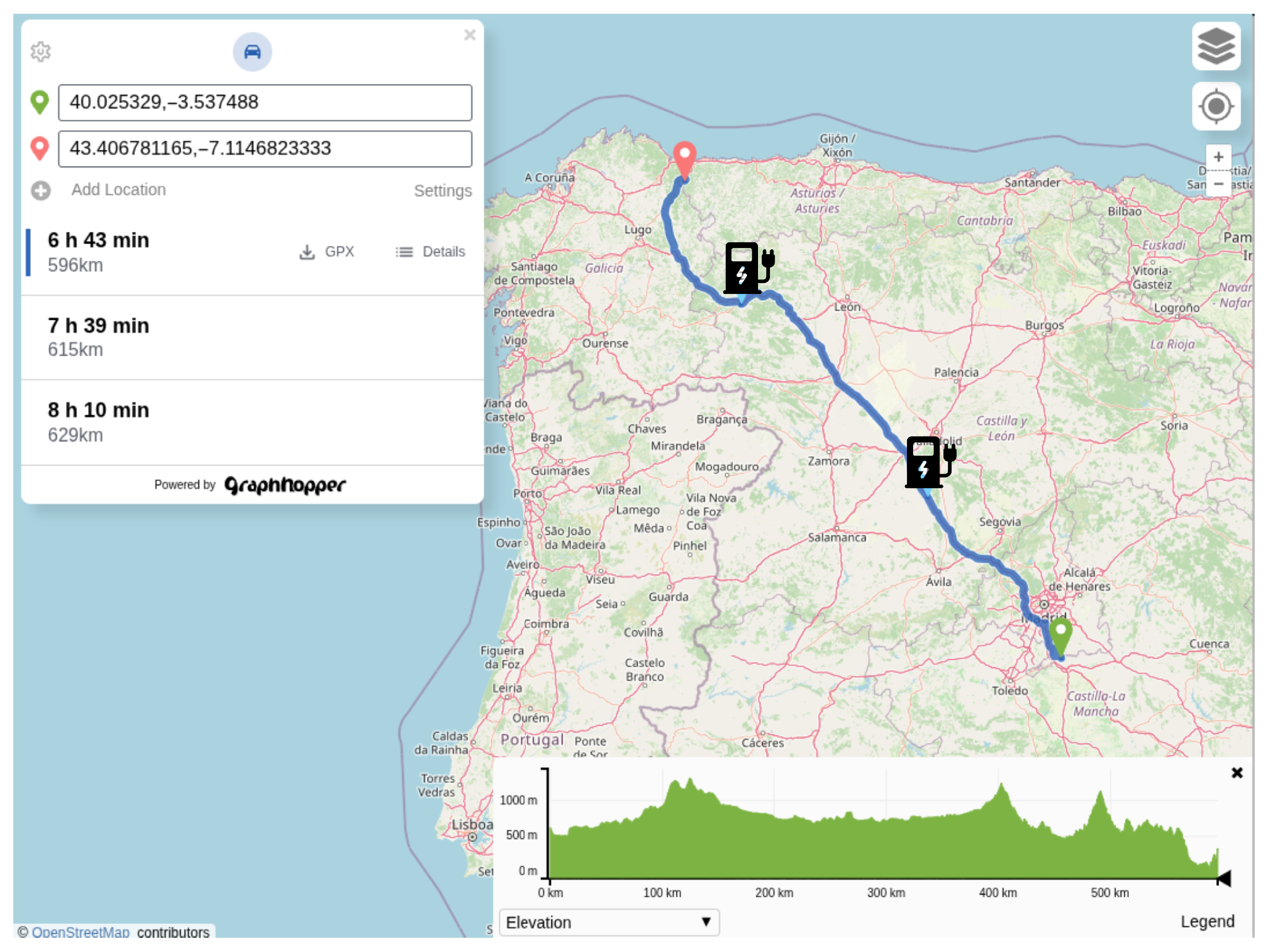 The route generated by the efficient planner. The initial point in Madrid and the goal point in Galicia. The black icons correspond with the charging stations.