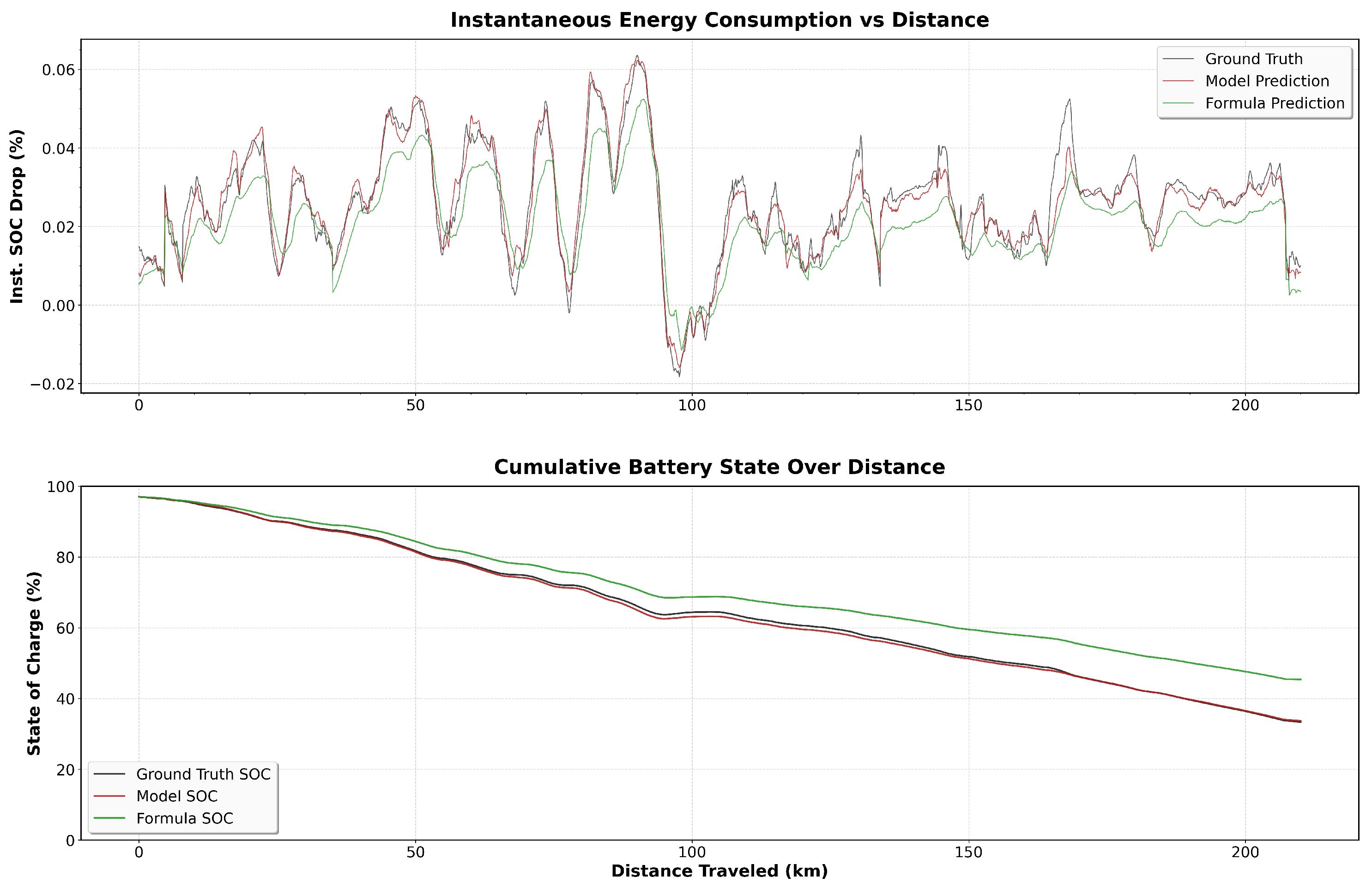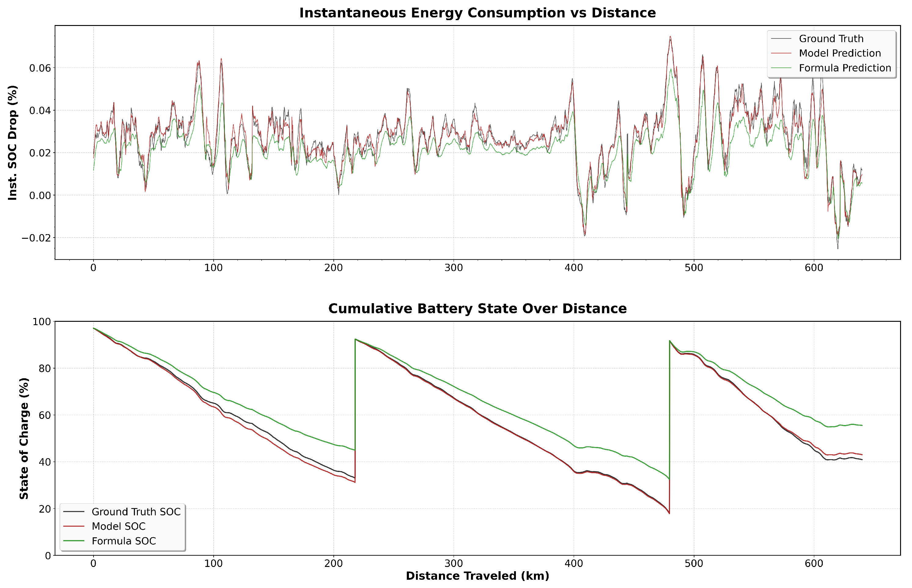 Comparison for the Madrid–Galicia route. The black line represents the actual SoC, the red line is the proposed model’s prediction, and the green line is the formula prediction.
