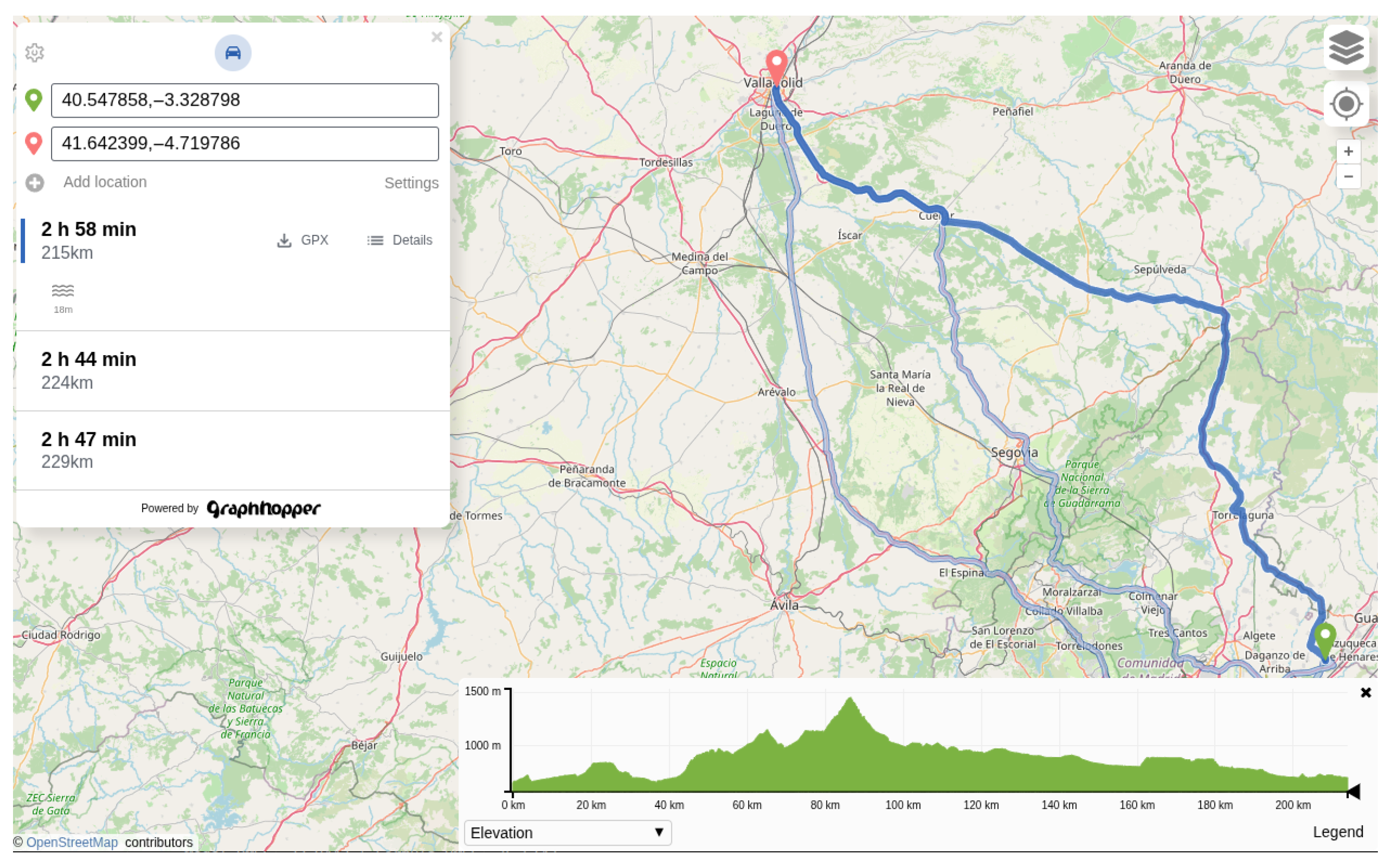 Route computed by the optimized planner, starting in Madrid and ending in Valladolid.