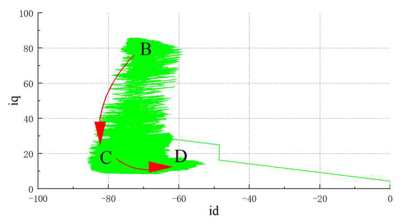 - Zone 2: This phase is defined as the constant-power weak-field zone, also known as the first weak-field stage. The IPMSM operates above base speed using leading-angle weak-field control, with its trajectory shown as curve AB in Figure 3. The motor is constrained by both the current limit circle and the voltage limit circle, resulting in reduced torque (i.e., load-carrying capacity) while output power remains nearly constant. To continue accelerating, the motor must transition into the second weak-field stage.
