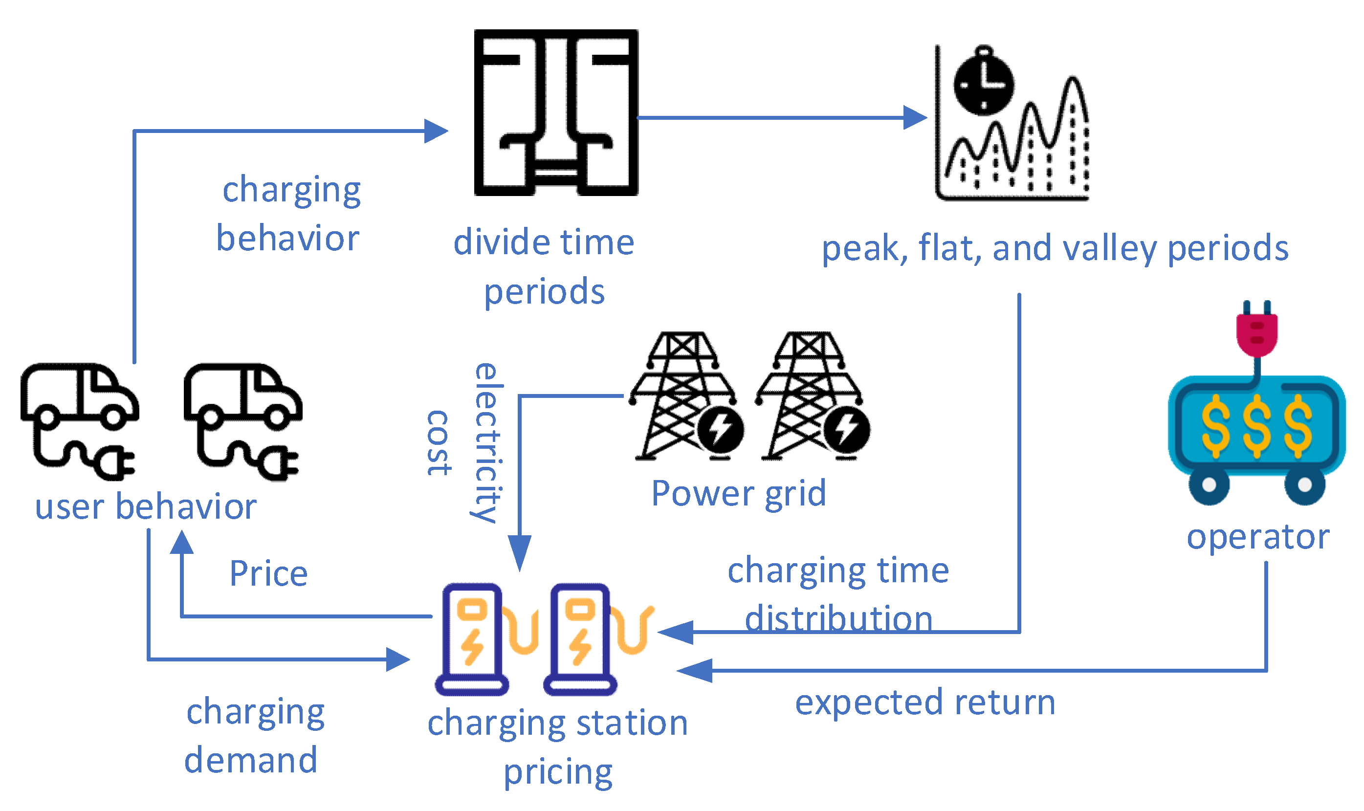 The dynamic pricing process of EV charging stations is fundamentally guided by users’ charging behaviors and electricity procurement costs, aiming to maximize profitability while ensuring operational efficiency. As illustrated in Figure 1, the process begins with an analysis of user charging patterns—including preferred charging times and demand levels—to identify distinct temporal demand characteristics. Based on these insights, the day is divided into peak, flat, and off-peak periods, each associated with different electricity prices.