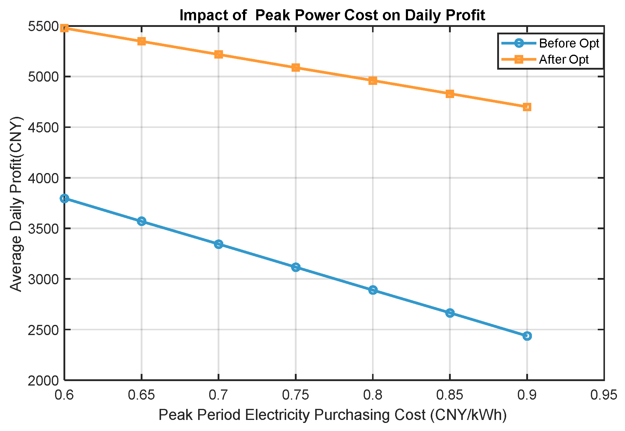 Enhanced robustness: Under rising electricity procurement costs, the optimized strategy exhibits a slower profit decline compared with the baseline strategy. This reflects stronger adaptability and resilience to external cost disturbances.