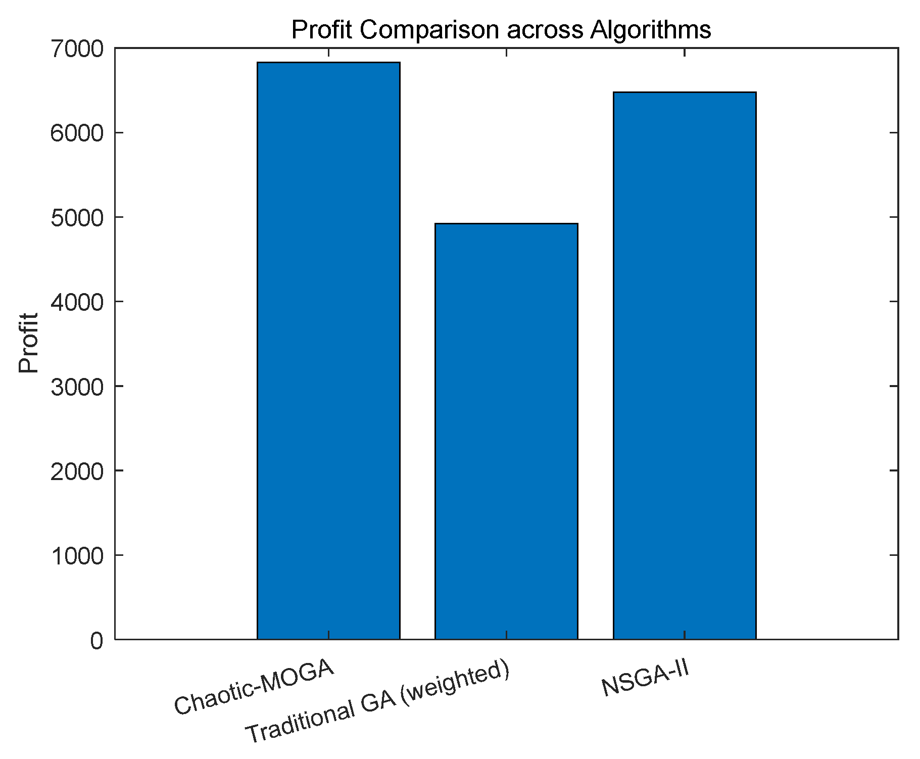 Figure 9 and Figure 10 report the economic outcomes under the same demand–response model and operational constraints. As shown in Figure 9, the proposed chaotic-MOGA achieves the highest station profit among the three algorithms, indicating that introducing chaotic dynamics enhances population diversity and improves the exploration–exploitation balance in the pricing search space. In contrast, the traditional weighted-sum GA yields a noticeably lower profit, which is expected because scalarization tends to bias the search toward a single trade-off and may miss high-quality Pareto-optimal regions.