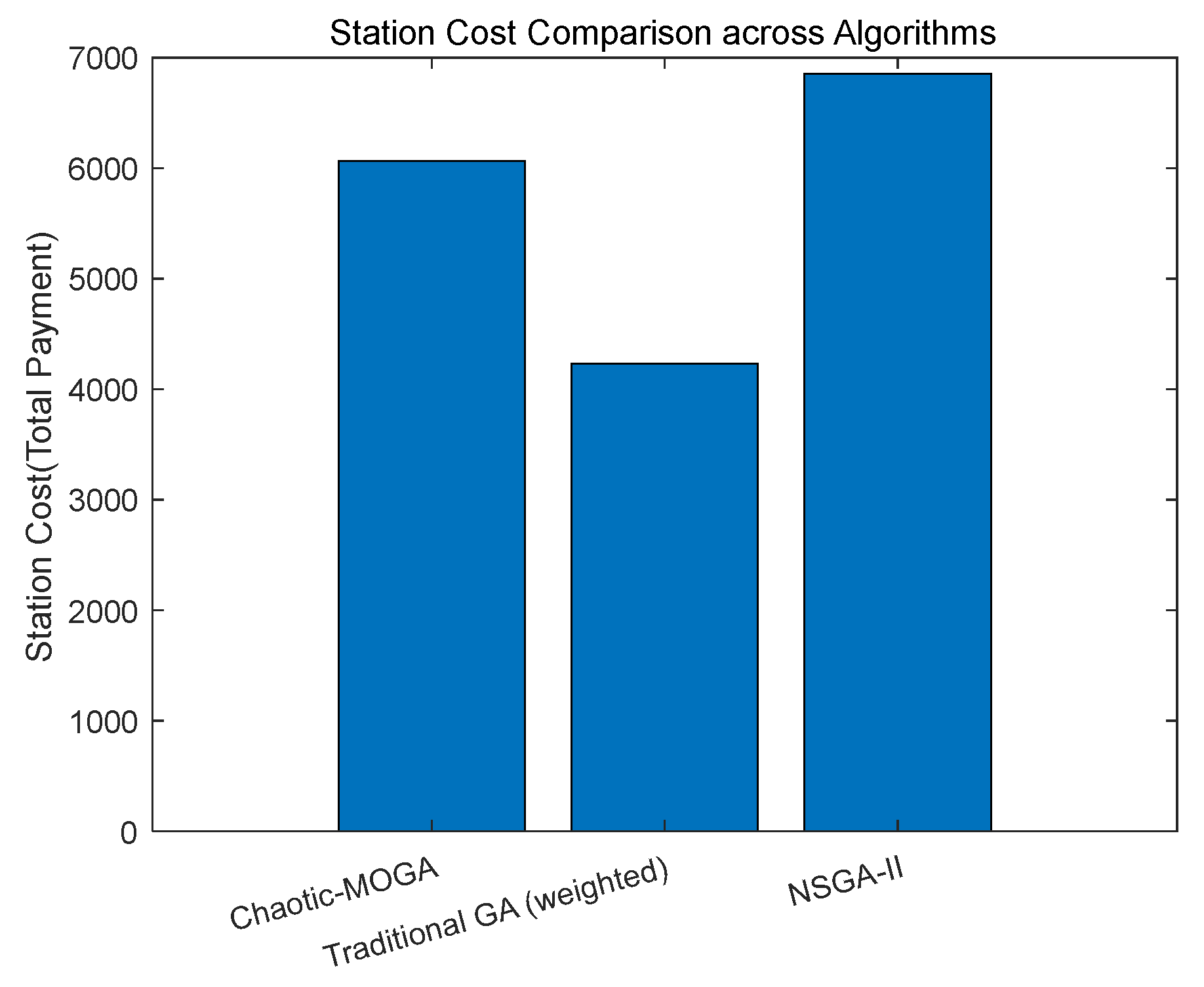 In addition, comparative experiments were conducted to evaluate the effectiveness of the proposed chaotic genetic algorithm against a traditional weighted-sum genetic algorithm and a classical multi-objective optimization method (NSGA-II) with the same demand model and operational constraints. The results demonstrate that the chaotic genetic algorithm achieves a more favorable balance between charging station profit and operating cost, while also exhibiting improved convergence behavior.