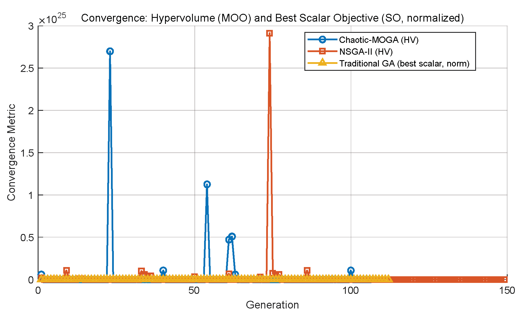 As illustrated in the comparative results in Figure 9, Figure 10 and Figure 11, the proposed chaotic-MOGA consistently exhibits superior overall performance compared with the traditional weighted-sum GA and the standard NSGA-II.