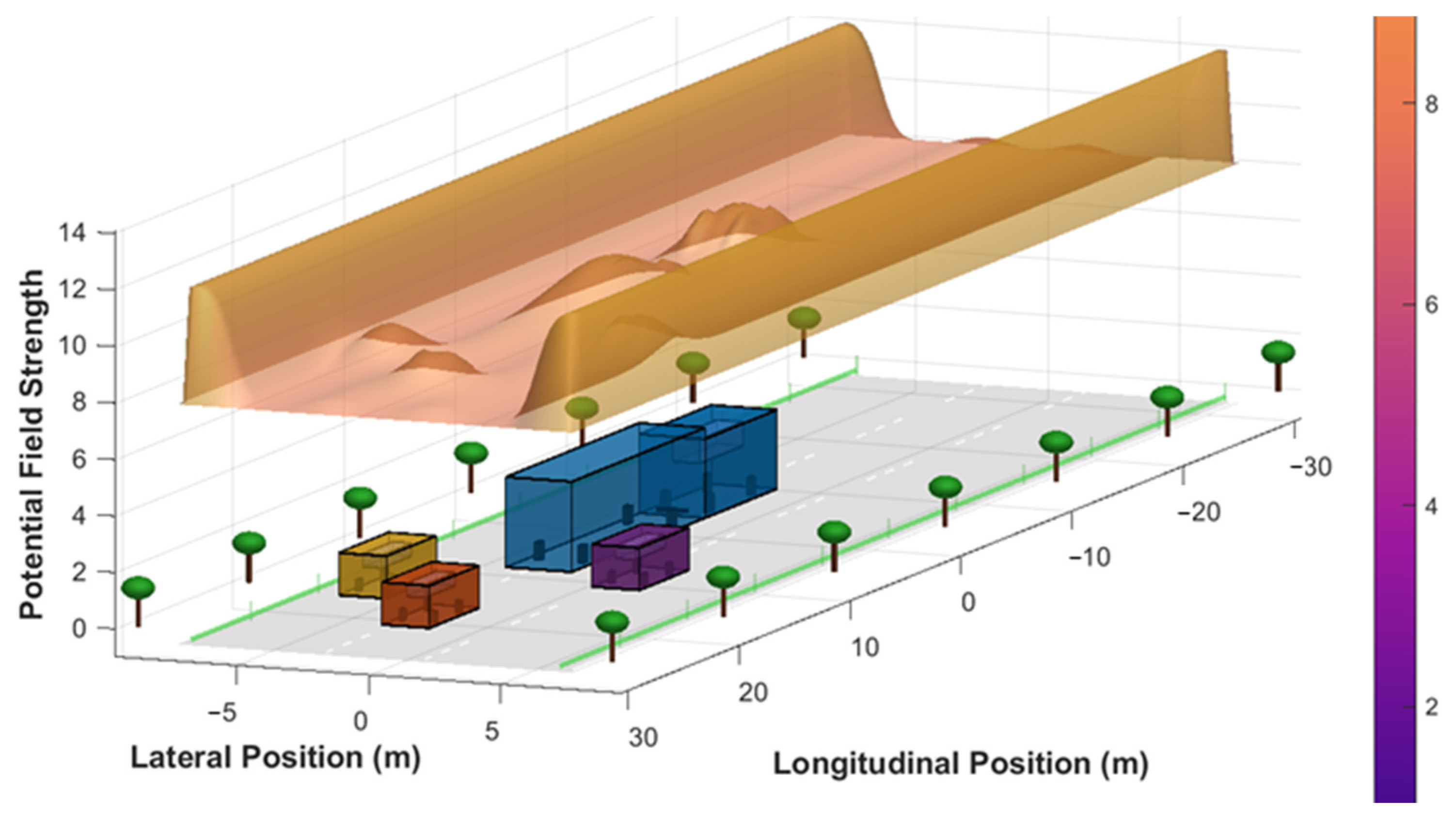 - Jensen, E.; Luster, M.; Pitts, B.; Sankaranarayanan, S. Using Artificial Potential Fields to Model Driver Situational Awareness. IFAC-PapersOnLine 2022, 55, 148–153. [Google Scholar] [CrossRef]
