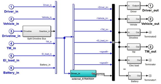 The data acquisition platform for the vehicle control system is shown in Figure 2. It collects signals including driver inputs, the current vehicle state, transmission system signals, and the status of the motor and battery. The vehicle control system analyzes these data and signals to obtain the correct instructions and transmits them to each sub-control system to complete the final work. The cyan module in the figure is the external energy management strategy module.