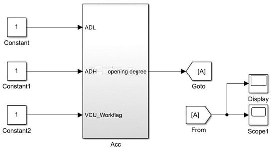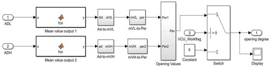 Finally, the pedal opening value calculated from the ADH and ADL signals is averaged and the data type is converted. And the final result is transmitted to the vehicle control system, thereby realizing the driver’s intention to operate the vehicle. These accelerator pedal signal value modules are shown in Figure 6.