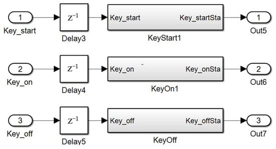 In order to prevent the electrical equipment from powering up at the same time, which may cause the power battery to overload instantly, the vehicle key position should change progressively. There are three key positions of OFF, ON and START in electric vehicles. Among them, OFF indicates that all electrical equipment except for the anti-theft system has been turned off. ON denotes that the entire vehicle is powered by a low-voltage battery and enters self-check mode. Electrical equipment, such as the radio, dashboard, and indoor lights, is working properly. START indicates that the entire vehicle is powered by high voltage, and equipment such as air conditioning and fuel pumps are operating normally. The driver’s choice of the key gear determines the switching of the vehicle’s working mode. To ensure the accuracy of signal acquisition by the vehicle control system and the normal operation of the vehicle, it is necessary to filter key signals to obtain continuous, accurate and stable signals. The key signal acquisition platform is shown in Figure 8.
