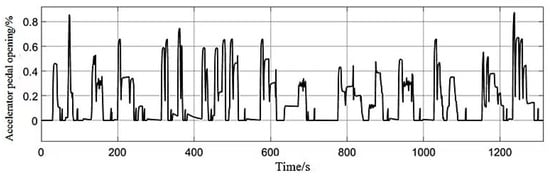 where θ(k) is the accelerator pedal opening; V(k) is the accelerator pedal signal acquisition value; Vmax is the maximum effective value of the accelerator pedal signal, which is 4.5 V; and Vmin is the minimum effective value of the accelerator pedal signal, which is 0.5 V. It corresponds to the effective range of the output voltage of the accelerator pedal sensor. To suppress signal noise, a moving average filter is adopted, with a window size of 10 sampling points and a sampling frequency of 100 Hz.