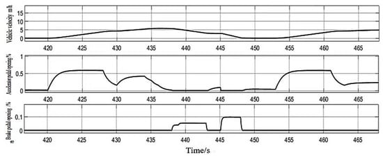To facilitate a detailed analysis of the dynamic response characteristics of the control system under a typical driving cycle (encompassing start-up, acceleration, cruising, deceleration and restart), this study extracts a representative time window of 420–465 s from the QC/T759 driving cycle for an in-depth analysis. The variation trends of vehicle speed, accelerator pedal and brake pedal signals during this period are shown in Figure 14.