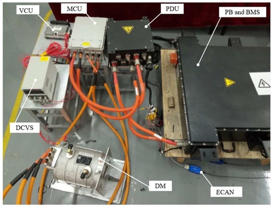 Based on the overall parameters of the electric vehicle shown in Table 1, the vehicle power hardware platform was constructed, and connections between various components were established. The hardware platform includes the Vehicle Control Unit (VCU), power battery (PB), Drive Motor (DM), Motor Control Unit (MCU), Power Distribution Unit (PDU), Direct Current Voltage Stabilizer (DCVS), Enhanced Controller Area Network (ECAN), and associated wirings, as shown in Figure 15. Table 3 below presents the specifications of key hardware components.