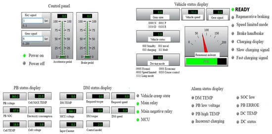 - Control Panel: Simulates the driver’s operations for the vehicle. The control panel visually represents vehicle operations such as Power On, Power Off, Accelerator Pedal, Brake Pedal, Key Signal, and Gear Signal [26].